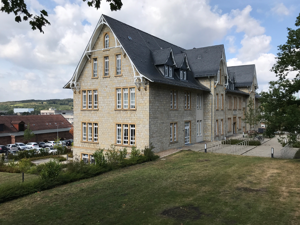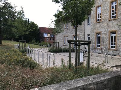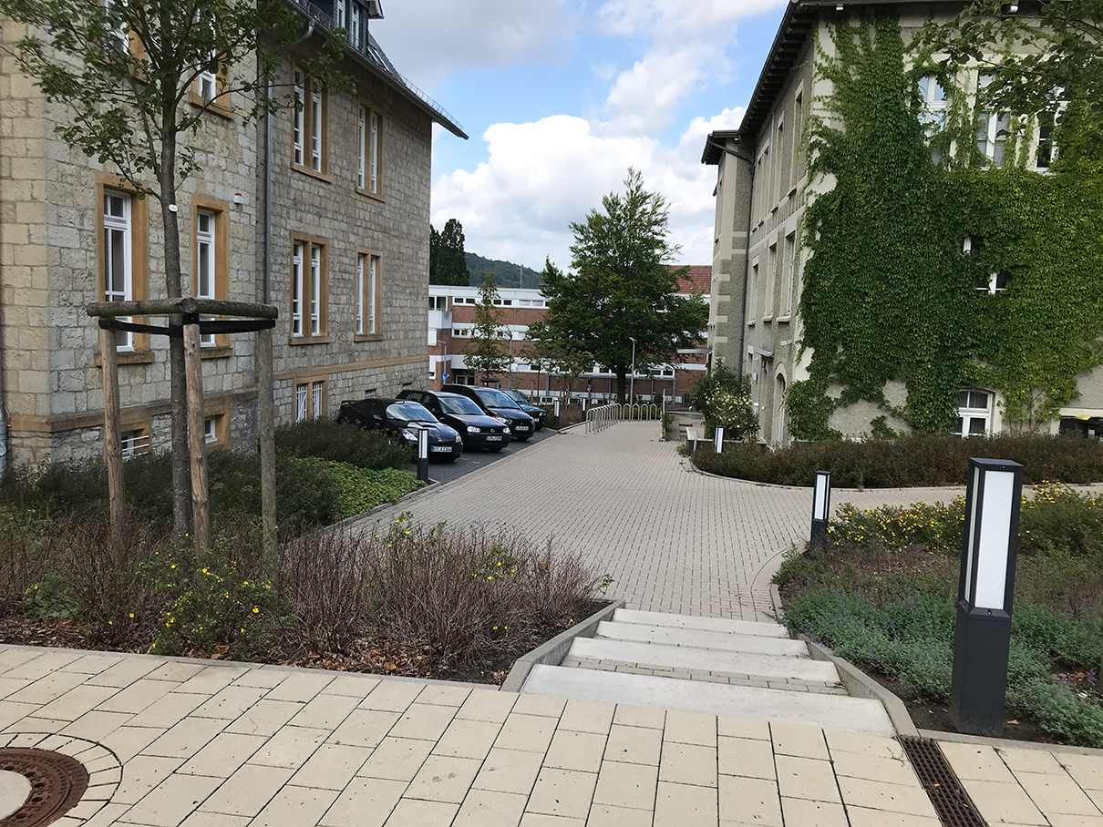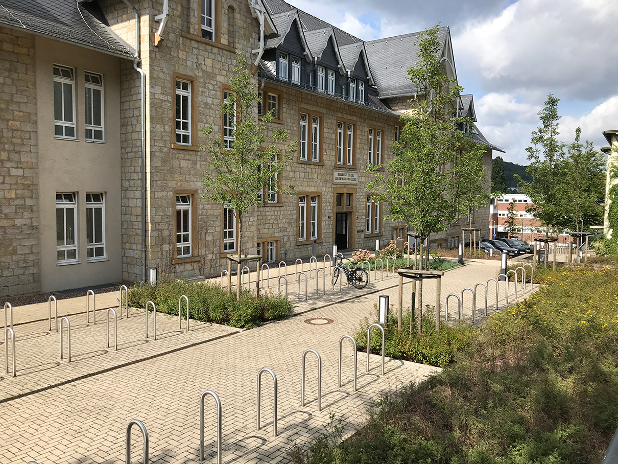 Mit dem Umbau des Wohnheims zum Hochschulbildungszentrum haben die Außenanlagen ein neues, klares Erscheinungsbild erhalten, das vor allem durch Funktionalität und Übersichtlichkeit geprägt ist. Die Wegeführung ist bewusst einfach und übersichtlich gestaltet, um den täglichen Ablauf für Studierende, Mitarbeitende und Besucher zu erleichtern. Neue Stellplätze für PKW und Fahrräder sind geschickt positioniert und bieten barrierefreie Zugänge zu den Gebäuden.