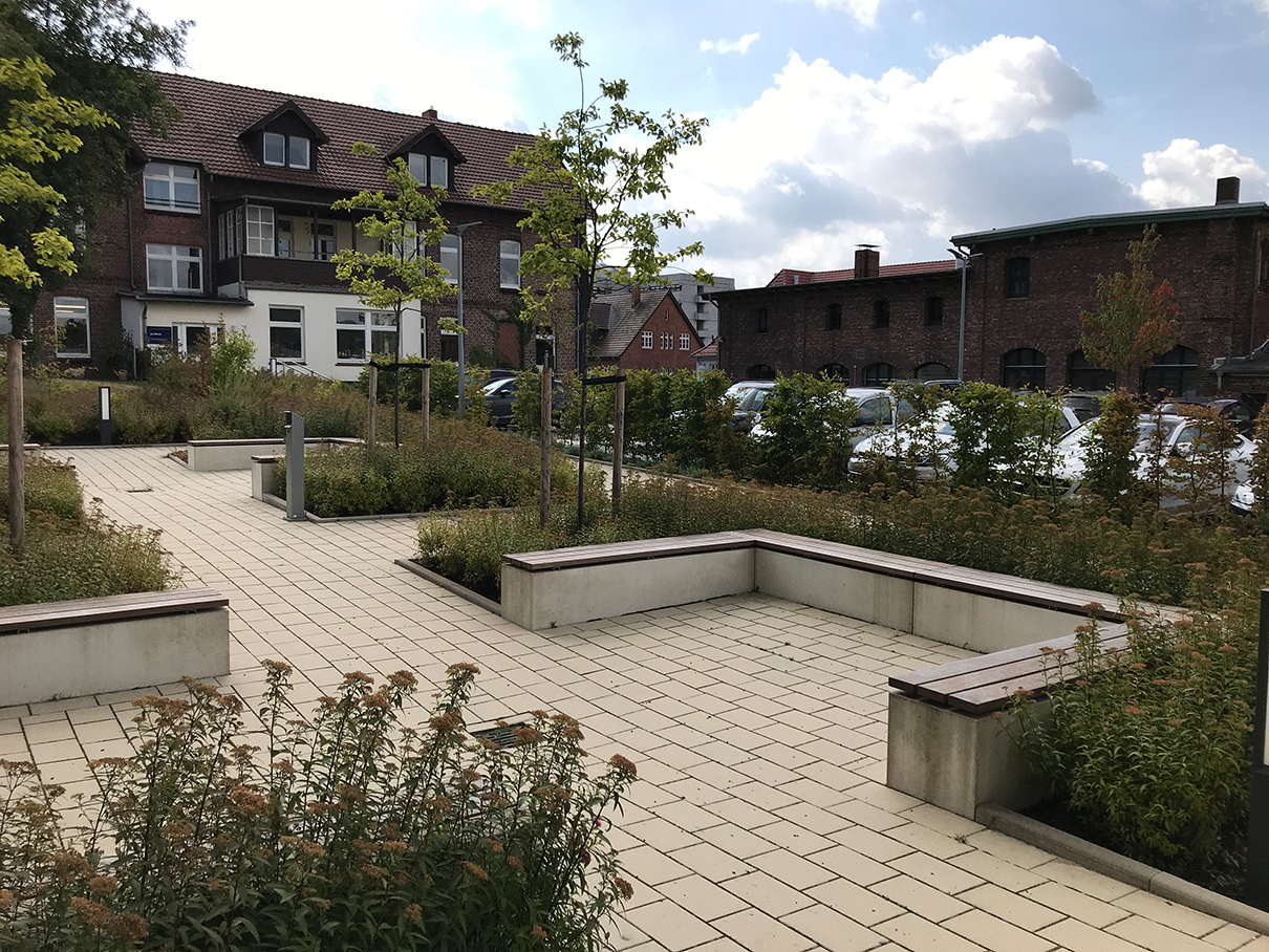 Kleine Grünflächen und punktuell gesetzte Bepflanzungen bringen Farbe und Struktur in die Außenanlagen und setzen frische, lebendige Akzente zwischen den funktionalen Flächen. Am Hintereingang des Gebäudes entstand ein kompakter Platz, der durch seine klare Gestaltung Ruhe und Orientierung vermittelt. Sitzmöglichkeiten und die angrenzenden Pflanzflächen laden dazu ein, kurz innezuhalten oder Begegnungen zu erleben. Studierende können hier kleine Pausen einlegen und neue Energie tanken, bevor sie in den Alltag zurückkehren.