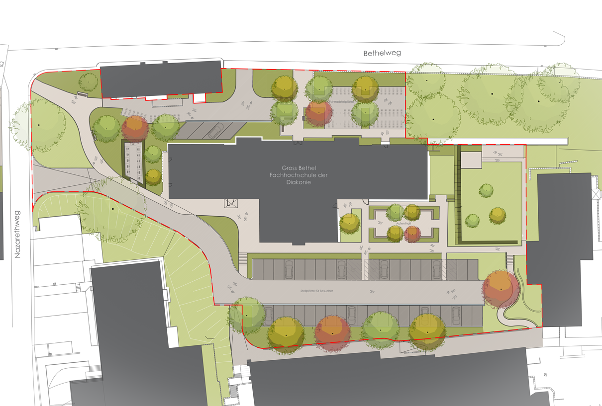 Die Kombination aus klar strukturierten Wegen, Stellplätzen und großzügigen Grünflächen schafft ein lebendiges Umfeld, das zugleich Ruhe, Orientierung und Nutzungskomfort bietet. Die Außenanlagen vermitteln ein Gefühl von Ordnung und Modernität, ohne den Menschen aus dem Blick zu verlieren. So entstand ein Campusbereich, der den Studienalltag unterstützt, funktionale Anforderungen erfüllt und gleichzeitig kleine, angenehme Momente des Verweilens ermöglicht.