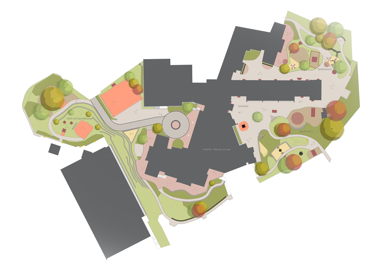 Spielerische Elemente runden das Angebot ab: Schaukeln, Trampoline und natürliche Elemente überbrücken Höhenunterschiede, regen die Fantasie der Kinder an und schaffen abwechslungsreiche Bewegungswelten. So verbindet der neue Schulhof Sport, Spiel, Natur und den geschützten Baumbestand auf harmonische Weise und lädt zu aktiven Pausen, kreativem Ausprobieren und geselligem Zusammensein ein.