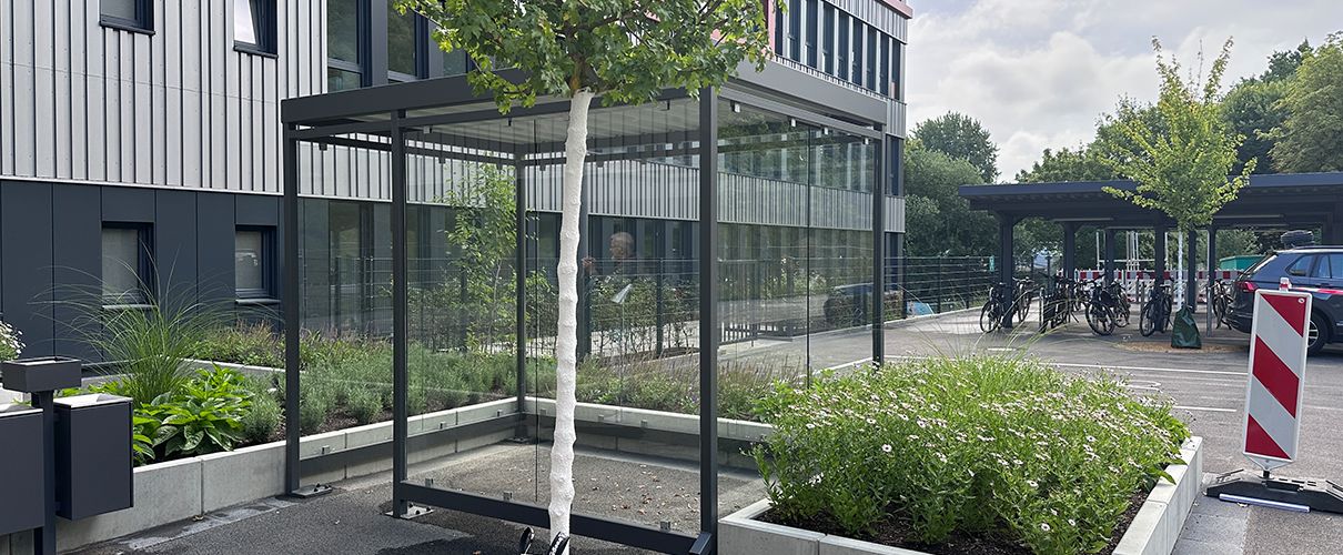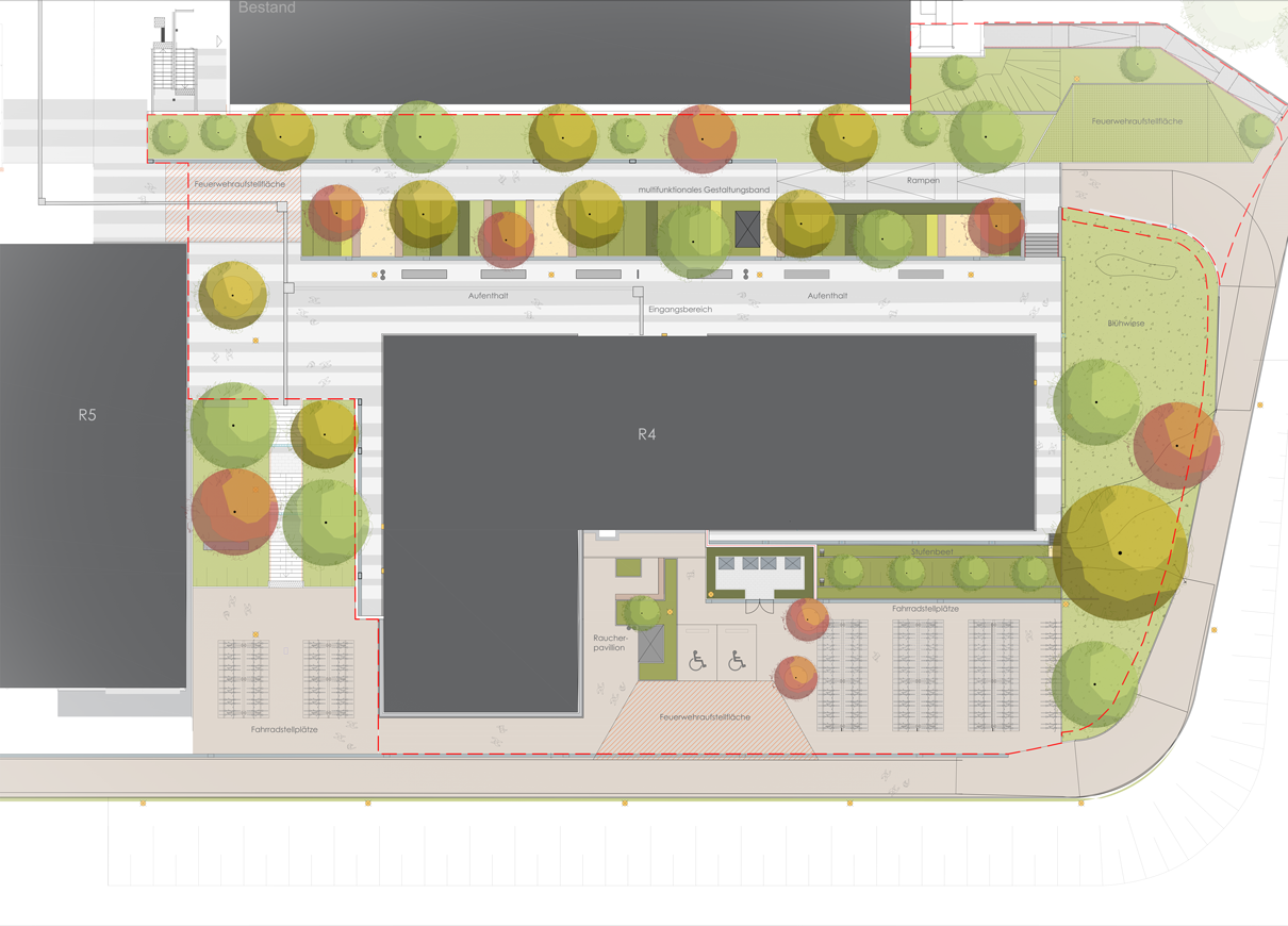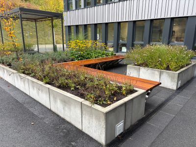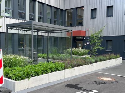Die Außenanlagen des Verwaltungs- und Bürogebäudes R4 am Campus Süd präsentieren sich modern, einladend und funktional zugleich. Der großzügige Vorderbereich empfängt Besucherinnen und Besucher mit einem repräsentativen Eingang, der durch ein attraktives, multifunktionales Band hervorgehoben wird. Bunte, lineare Pflanzungen und ruhige Aufenthaltsbereiche im Grünen schaffen hier eine einladende Atmosphäre, in der Arbeiten und Verweilen gleichermaßen Freude machen. Transparente Raucherpavillons und angrenzende Sitzblöcke mit Holzauflage fügen sich harmonisch in das Ensemble ein und bieten praktische Aufenthaltsmöglichkeiten.