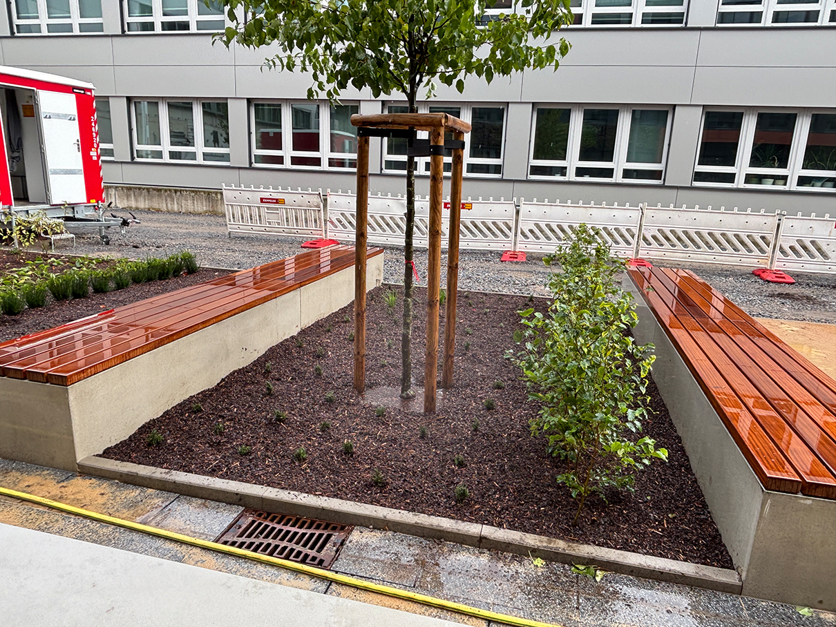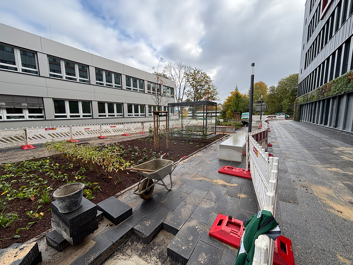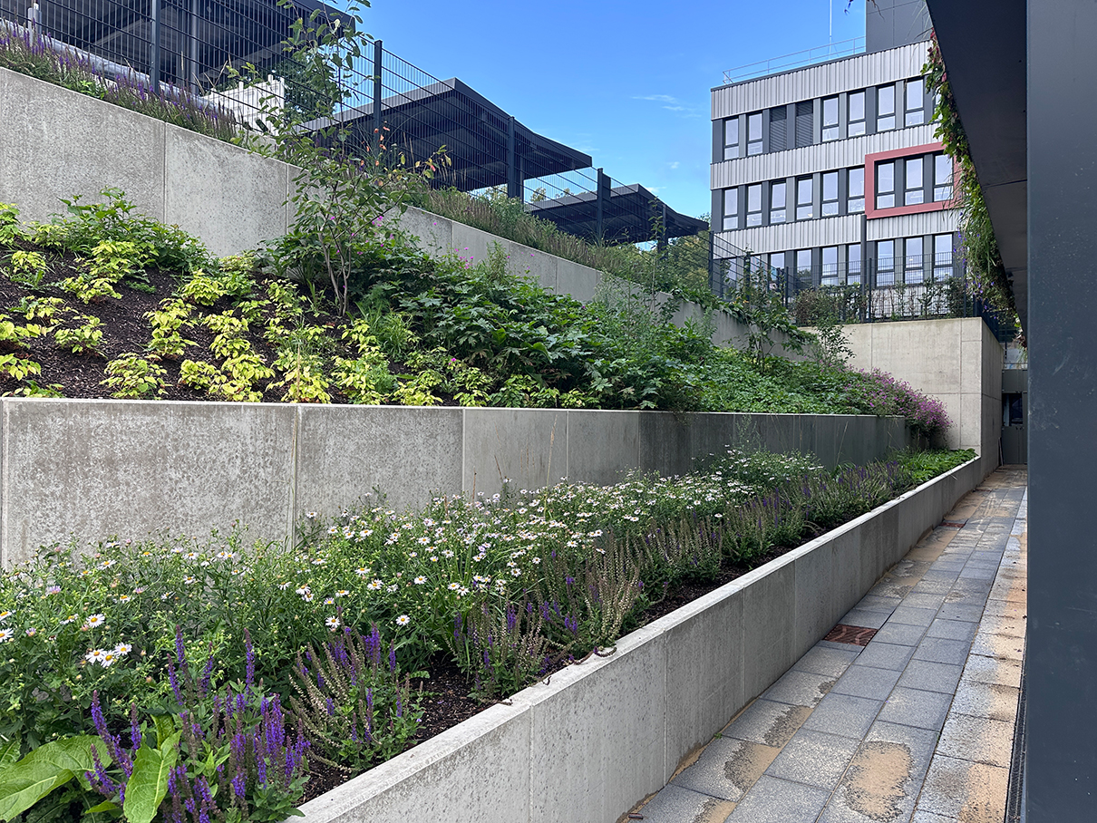 Ein besonderes Highlight ist das große Stufenbeet, das den Höhenunterschied zwischen den Bereichen elegant ausgleicht. Es bietet grüne, lebendige Ausblicke aus den Bürogeschossen und setzt einen frischen, naturnahen Akzent zwischen den Gebäuden. So entsteht ein Außenbereich, der nicht nur funktional ist, sondern auch zum Verweilen einlädt und den Campus Süd als modernen, durchdachten Arbeitsort erlebbar macht.