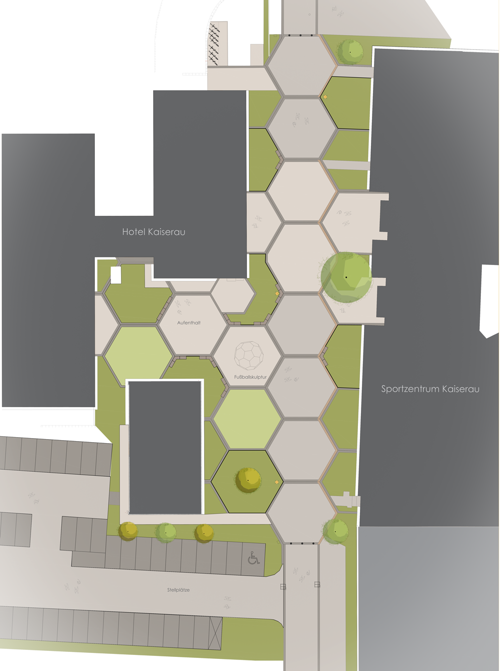 Das zentrale Gestaltungselement sind die Hexagone des Fußballs. Anstelle der klassischen Farben erstrahlen sie in hellem, modernen Pflaster. Jedes Hexagon erzählt seine eigene Geschichte: Manche laden zum Verweilen ein, andere verbinden Wege oder werden zu grünen Inseln mit Stauden und Gräsern. Zusammen formen sie ein lebendiges Mosaik, das Bewegung sichtbar macht und den Rhythmus des Sportzentrums in den Außenraum trägt.