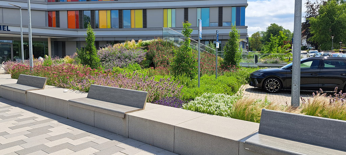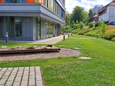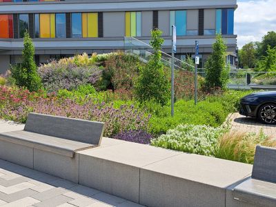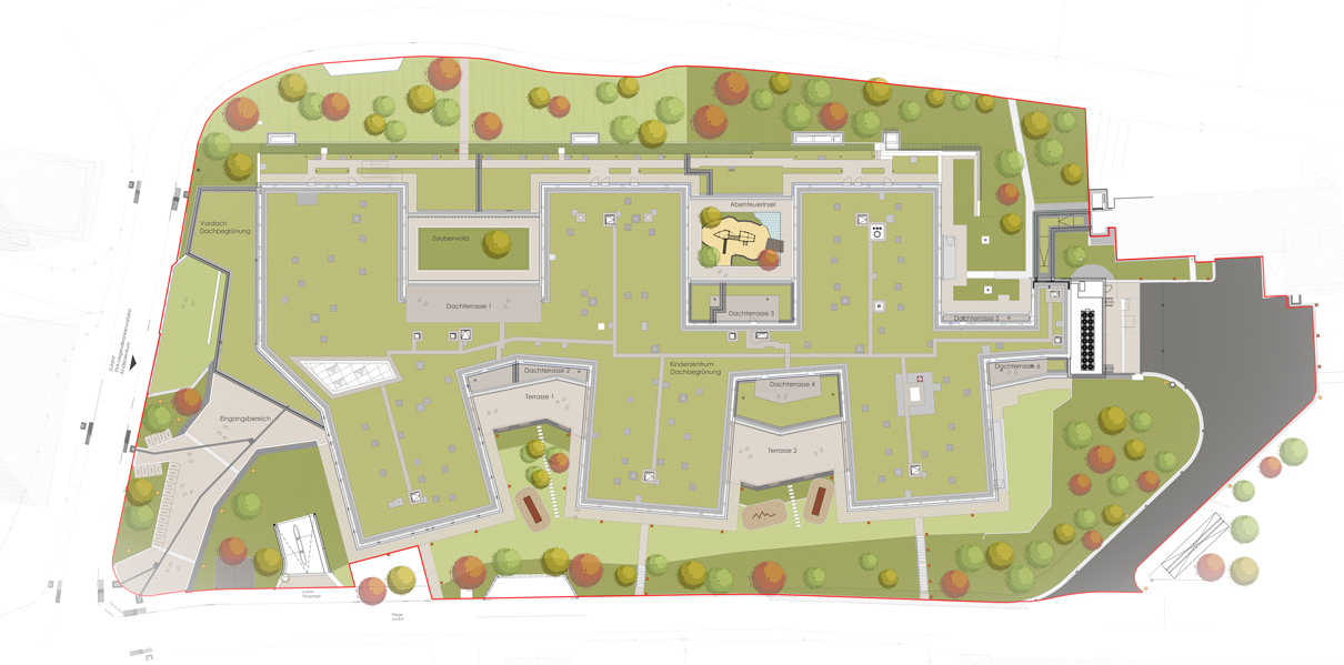 Der repräsentative Eingangsbereich hebt den Neubau wirkungsvoll hervor. Ein bepflanzter Hügel verwandelt diesen Bereich in ein lebendiges grünes Highlight, das in den warmen Monaten zum Verweilen und Beobachten einlädt. Die Dachbegrünungen schaffen nachhaltige Effekte und verleihen dem Kinderzentrum ein frisches, naturnahes Flair, das Patienten, Familien und Besucher gleichermaßen willkommen heißt.