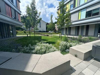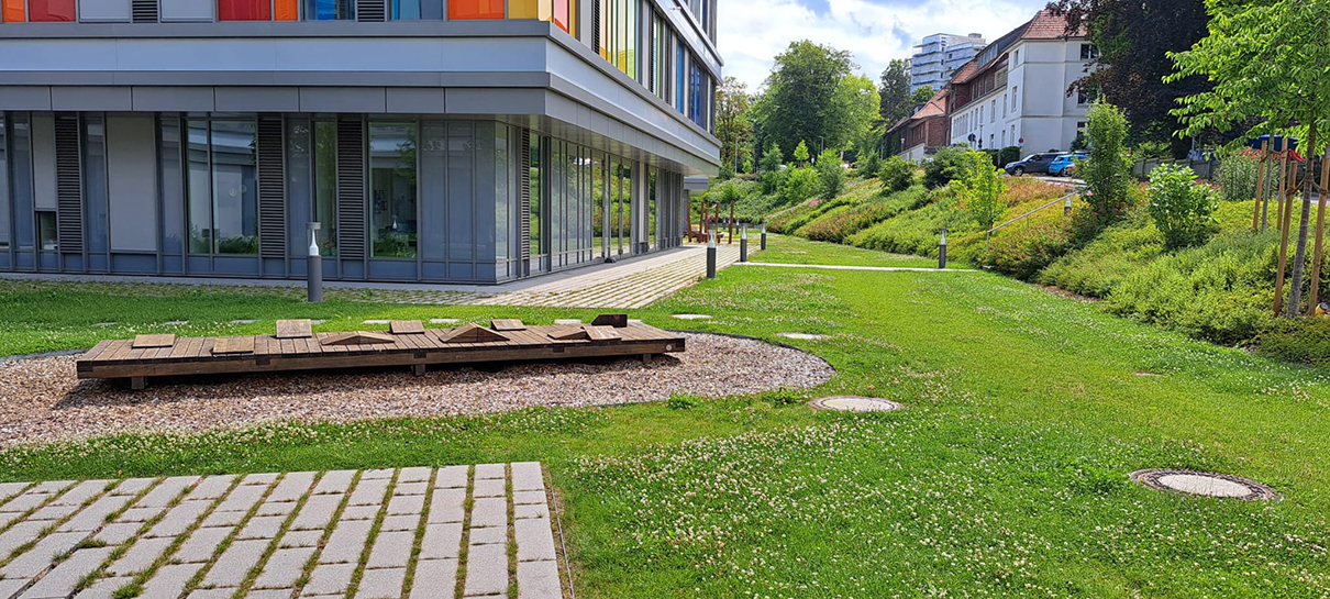 Mit dem Neubau des Kinderzentrums am Klinikum Bethel entstanden die Außenanlagen als neues, einladendes Umfeld, das Kinder, Familien und Besucher begeistert. Großzügige Innenhöfe, wurden mit vielfältigen Spielbereichen, sonnigen und schattigen Aufenthaltsflächen, weitläufigen Gehwegen kombiniert und schaffen ein lebendiges, grünes Ambiente. Zudem fördern extensive Dachbegrünungen Klima und Biodiversität.