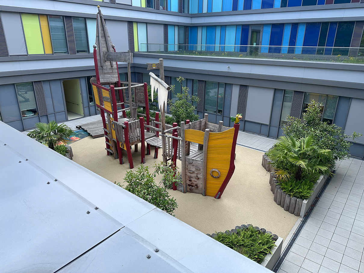 Jeder Innenhof erzählt seine eigene Geschichte. Die Abenteuerinsel mit exotischer Bepflanzung, einem Holzsteg und einem Spielschiff lädt Kinder zu fantasievollen Erkundungstouren ein. Im Innenhof „Zauberwald“ sorgen geheimnisvolle Pflanzen, Hügel und versteckte Gestaltungselemente für magische Momente.