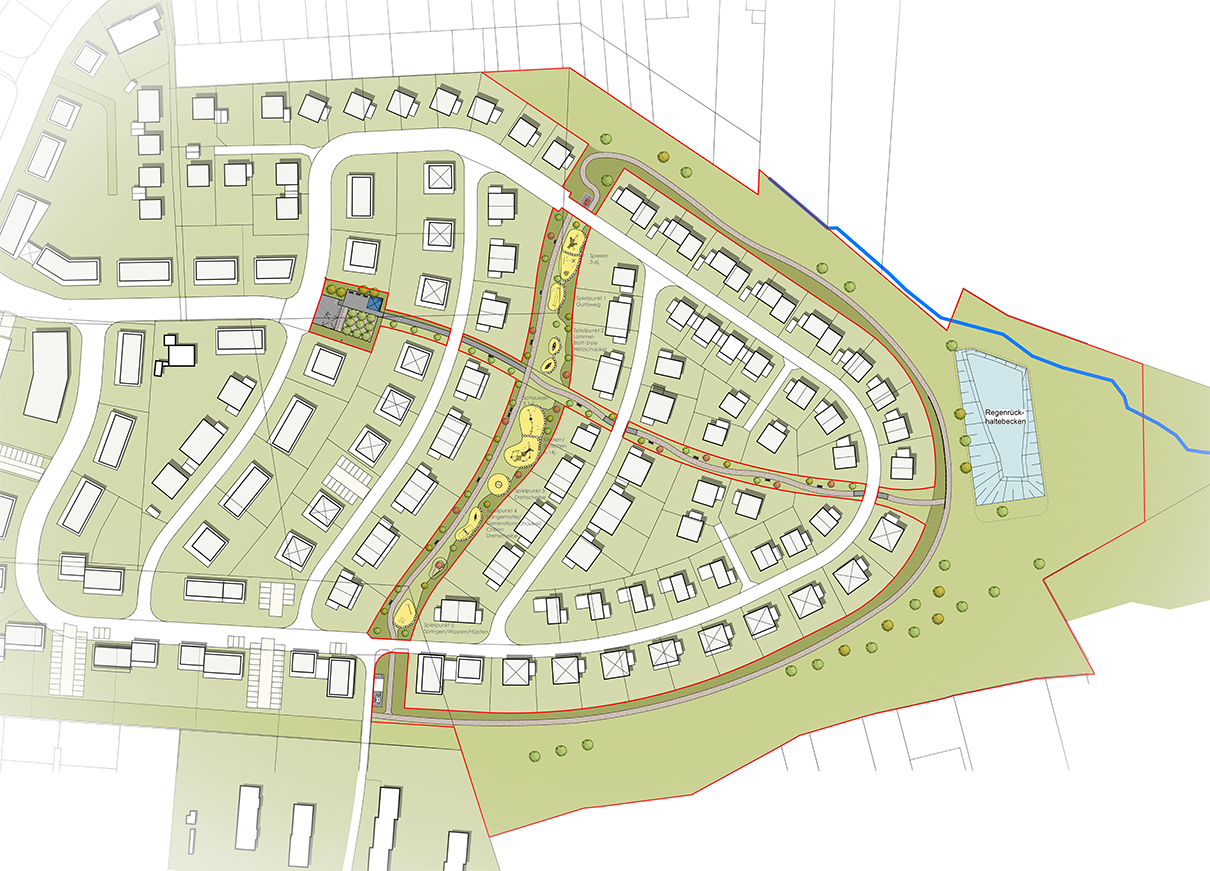 Das Herz des Quartiers bildet ein großer Grünzug, der sich durch das gesamte Wohngebiet zieht. Er lädt zum Spazieren, Verweilen und Entdecken ein. Spiel- und Aufenthaltsbereiche sorgen dafür, dass Jung und Alt gleichermaßen von der grünen Infrastruktur profitieren.