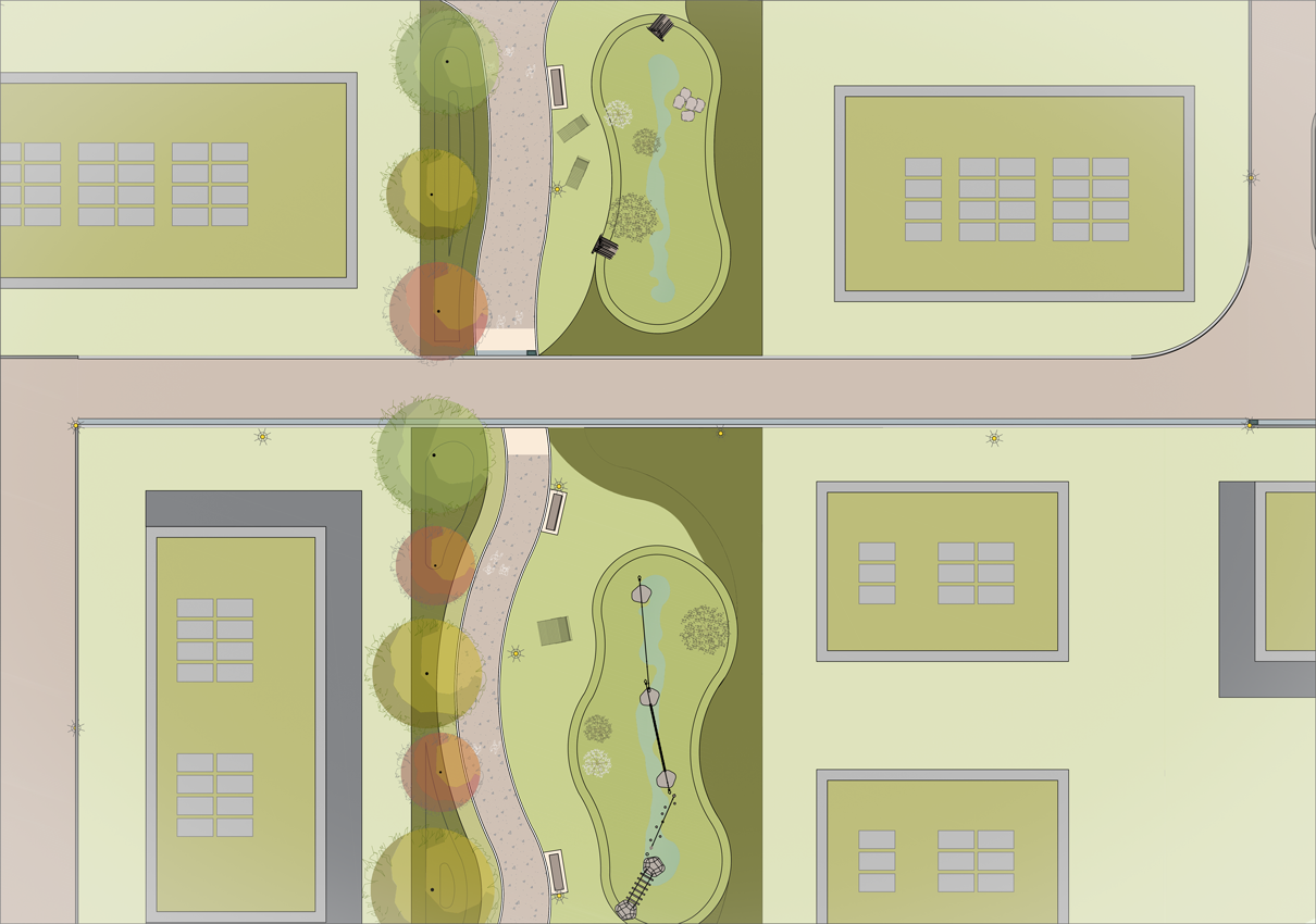 Der Grünzug wird naturnah gestaltet und ökologisch wertvoll. Regenwassermulden dienen der Versickerung und Verdunstung und werden zu kleinen Balancierpfaden aus Findlingen, Robinienholz und Baumstämmen, die Abenteuer und Entdeckung zugleich bieten. Mittelgroße und große Bäume, bepflanzte Wälle sowie Stauden und Bodendecker schaffen Schatten, Mikroklima und ein lebendiges, vielfältiges Landschaftsbild. Ergänzend können Reptilienhabitate entstehen, die die Biodiversität fördern.
