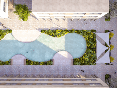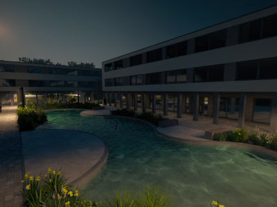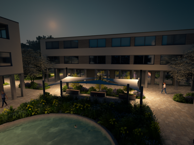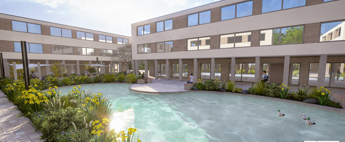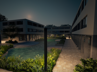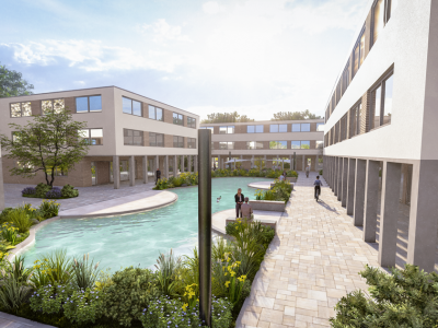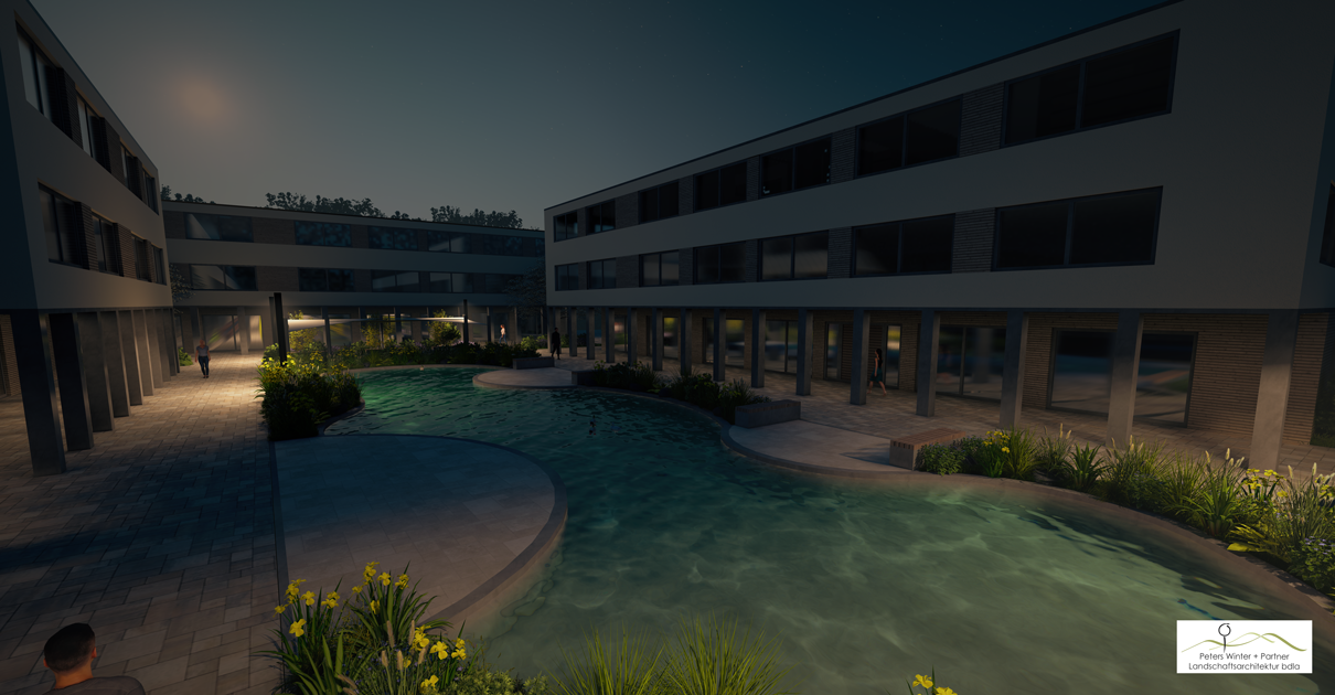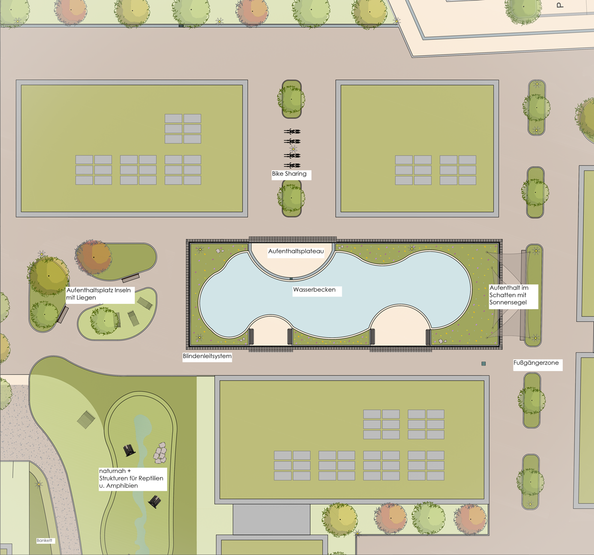 Rund um das Wasserbecken schaffen üppige Beete, Pflanzungen und Sonnensegel ein lebendiges, naturnahes Ambiente. Sitzgelegenheiten laden zum Ausruhen ein, und ein Blindenleitsystem ermöglicht barrierefreien Zugang. So entsteht ein Ort, an dem Wasser, Natur und Gemeinschaft auf nachhaltige Weise zusammenkommen, der Technik und Ästhetik verbindet und das Quartier zu einem erlebbaren, inspirierenden Raum für alle Generationen macht.