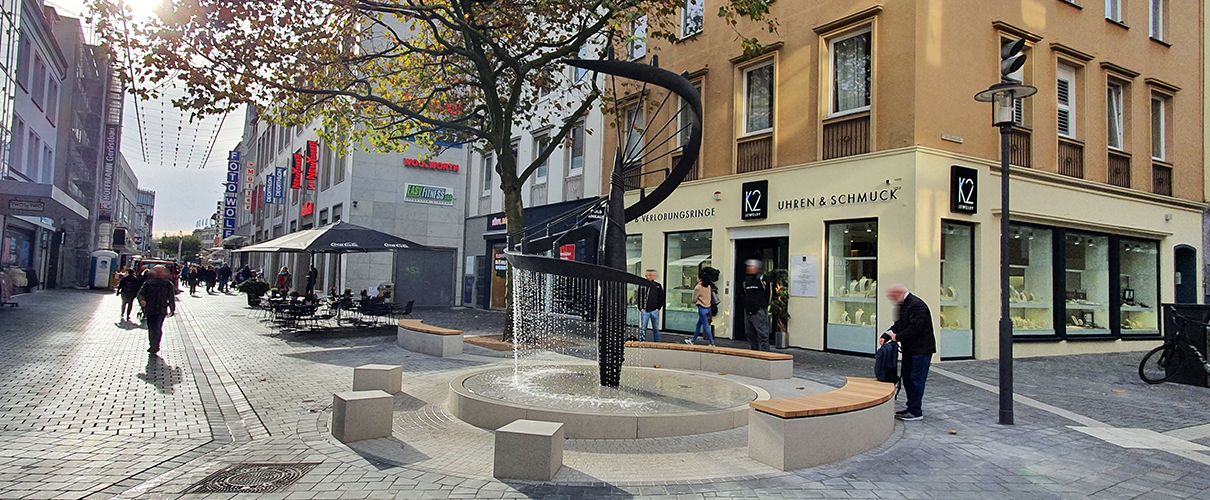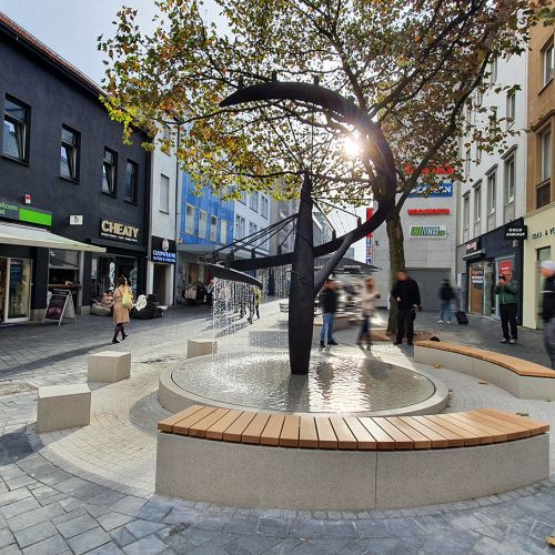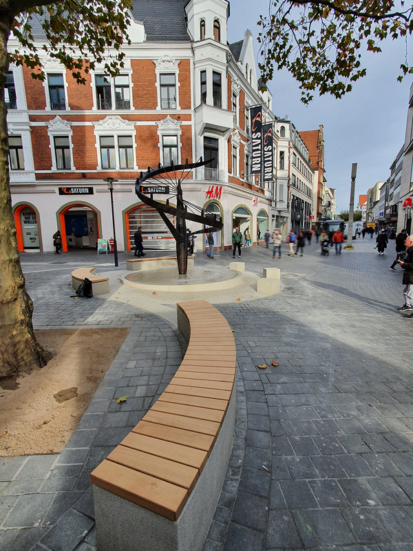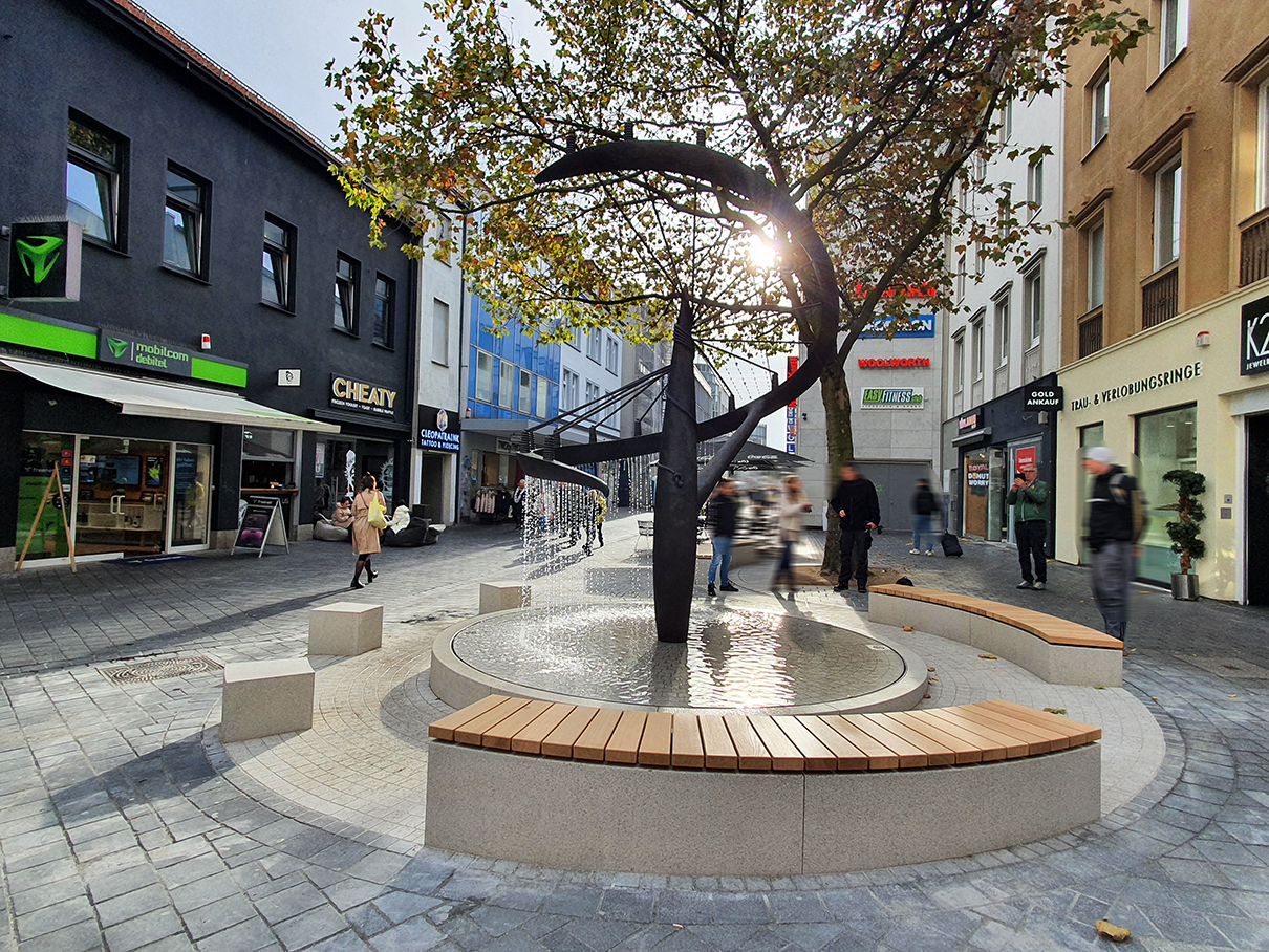 Es entstand rund um die historische Wasserskulptur ein kleiner, moderner Aufenthaltsbereich, der Kunst, Wasser und Stadtleben auf natürliche Weise miteinander verbindet.