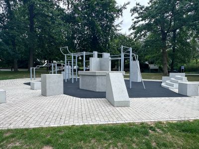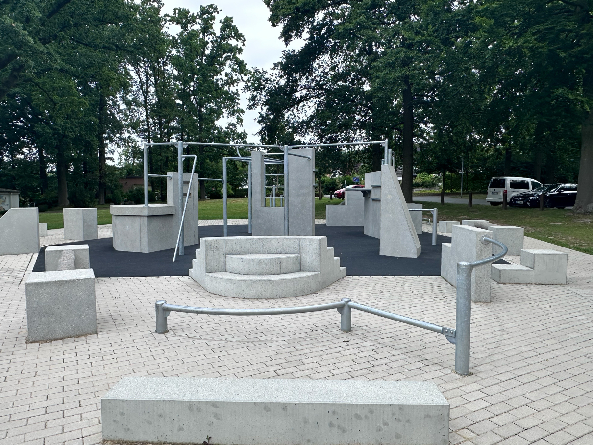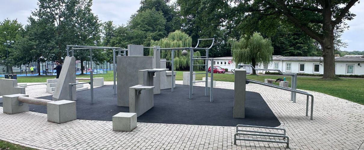 Die Anlage befindet sich direkt am Eingang des Sportparks und wird von den hohen Bestandsbäumen sowie einer Wegeverbindung zur angrenzenden Straße umrahmt. Sitzgelegenheiten laden zu Pausen und kurzen Erholungsmomenten ein, sodass Sport, Bewegung und Aufenthalt harmonisch kombiniert werden.