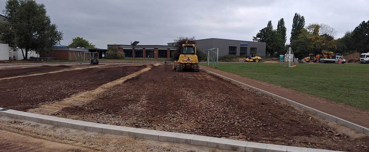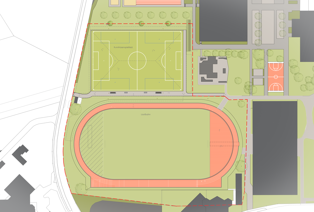 Die bestehende Kunststofflaufbahn wird saniert, sodass Läuferinnen und Läufer auf einer ebenen, sicheren Oberfläche trainieren können. Gleichzeitig wird die Entwässerung modernisiert: Ein Rigolenbauwerk sammelt und reguliert das Regenwasser. Entwässerungsmulden stauen das anfallende Oberflächenwasser bis zu 20 cm an und führen es bei Starkregenereignissen über Notabläufe in die öffentliche Kanalisation ab.
