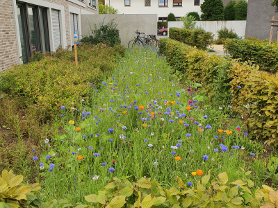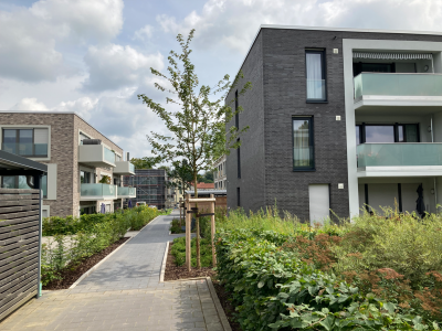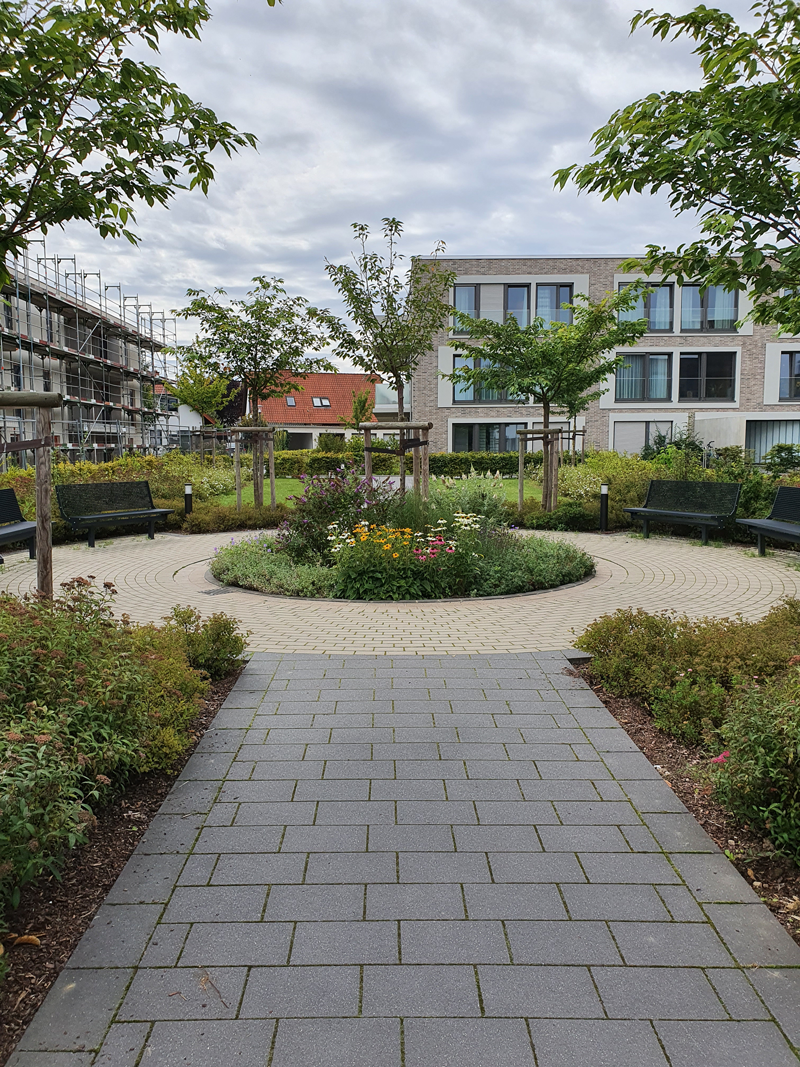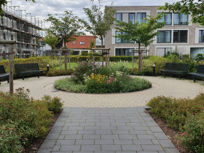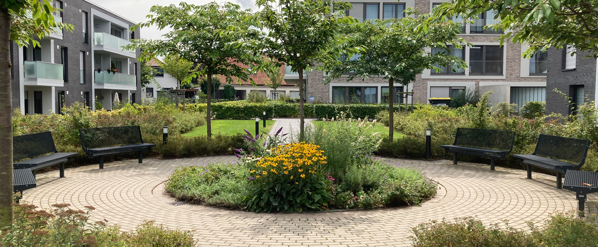 Besonders attraktiv ist der kleine Fußgängerkreisel: Umgeben von Hecken und üppiger Bepflanzung entstand hier ein ruhiger Rückzugsort im Grünen. Der Platz lädt gleichermaßen zum Entspannen wie zum Austauschen ein – ein Treffpunkt mitten im Quartier.