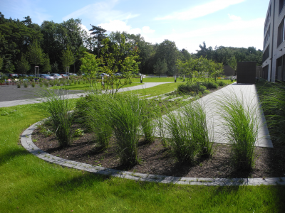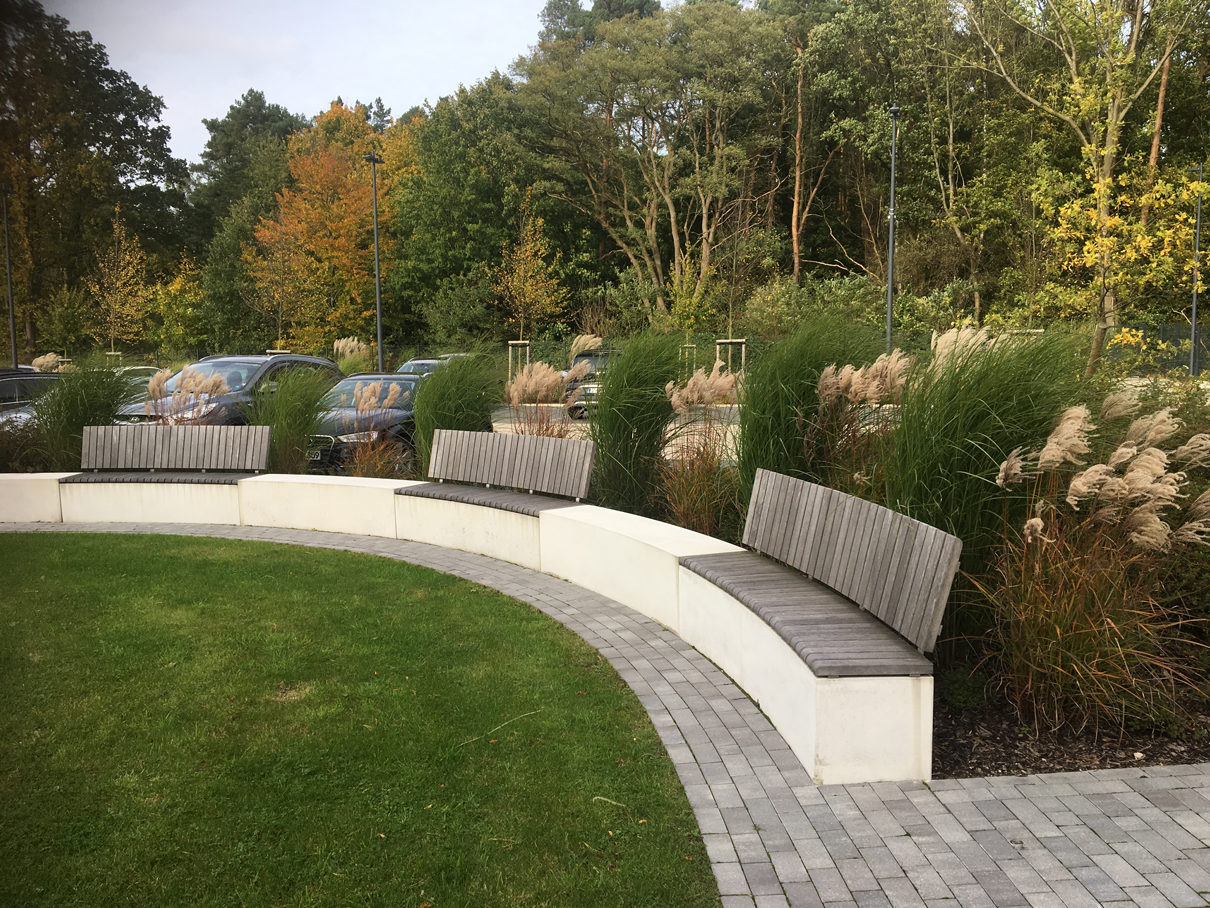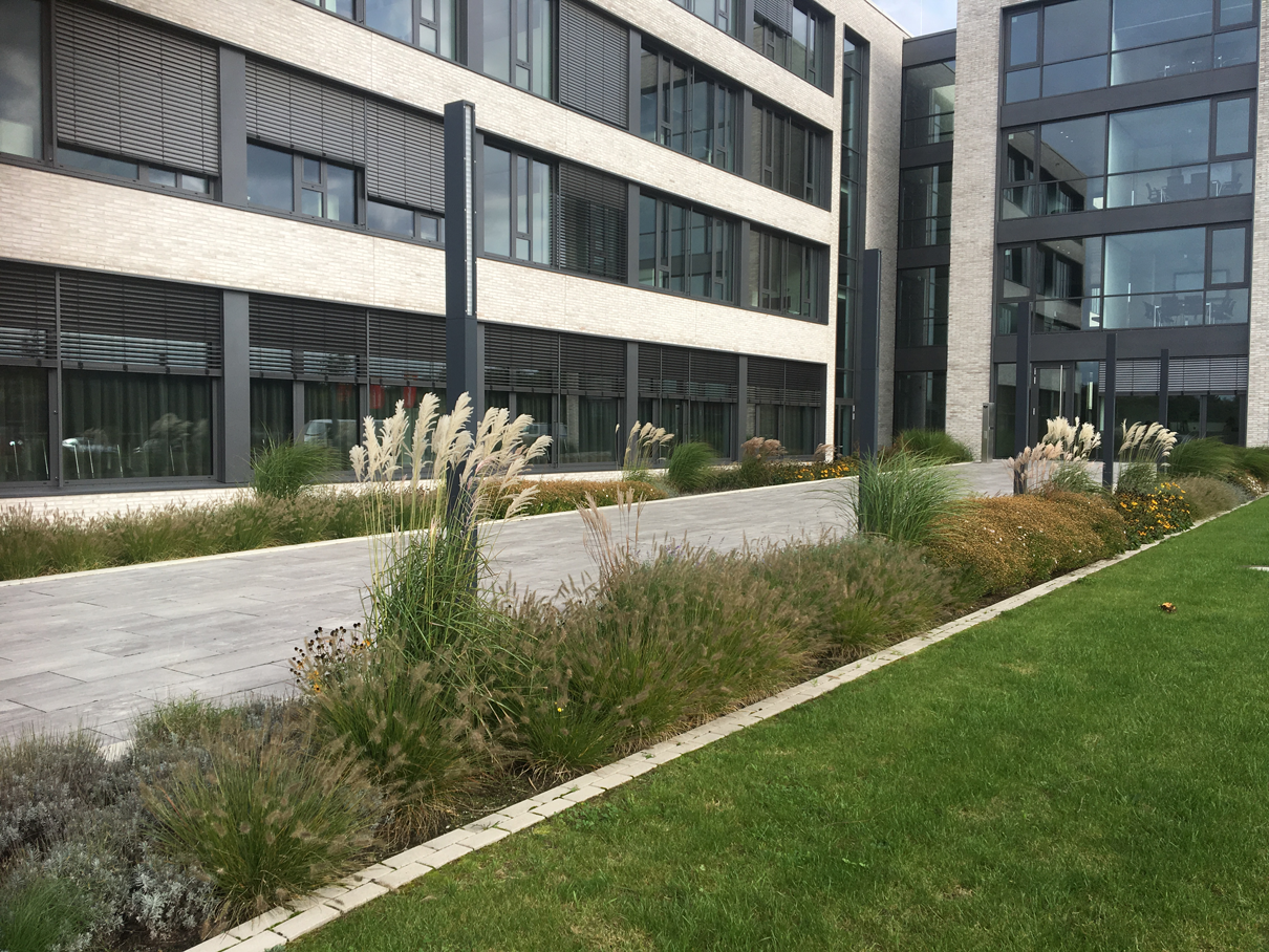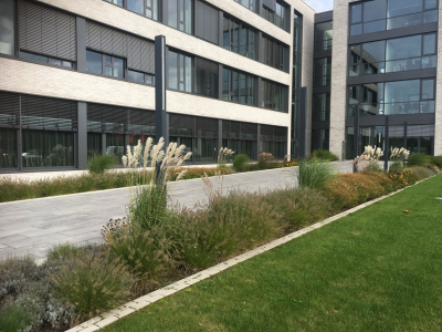 Ergänzend dazu entstehen ruhige Rückzugsorte, darunter eine tiefergelegte Terrasse im westlichen Bereich, umrahmt von blühenden Stauden und hohen Gräsern. Hier können Mitarbeitende die Natur genießen, sich entspannen oder sich ungestört unterhalten – ein grüner Rückzugsraum mitten im Arbeitsumfeld.