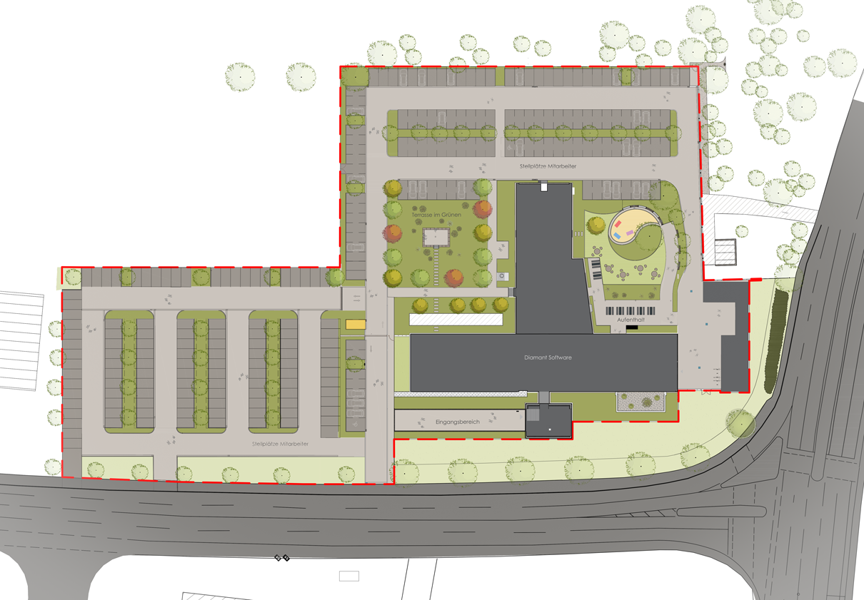 Die Neugestaltung der Außenanlagen bei der Firma Diamant Software verwandelt den Firmenstandort in einen Ort, an dem Arbeiten und Entspannen perfekt zusammenkommen. Neben modernisierten und neuen Stellplätzen laden großzügige Grünflächen zu Pausen, spontanen Treffen oder einfach zum Durchatmen im Grünen ein.