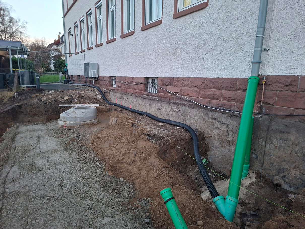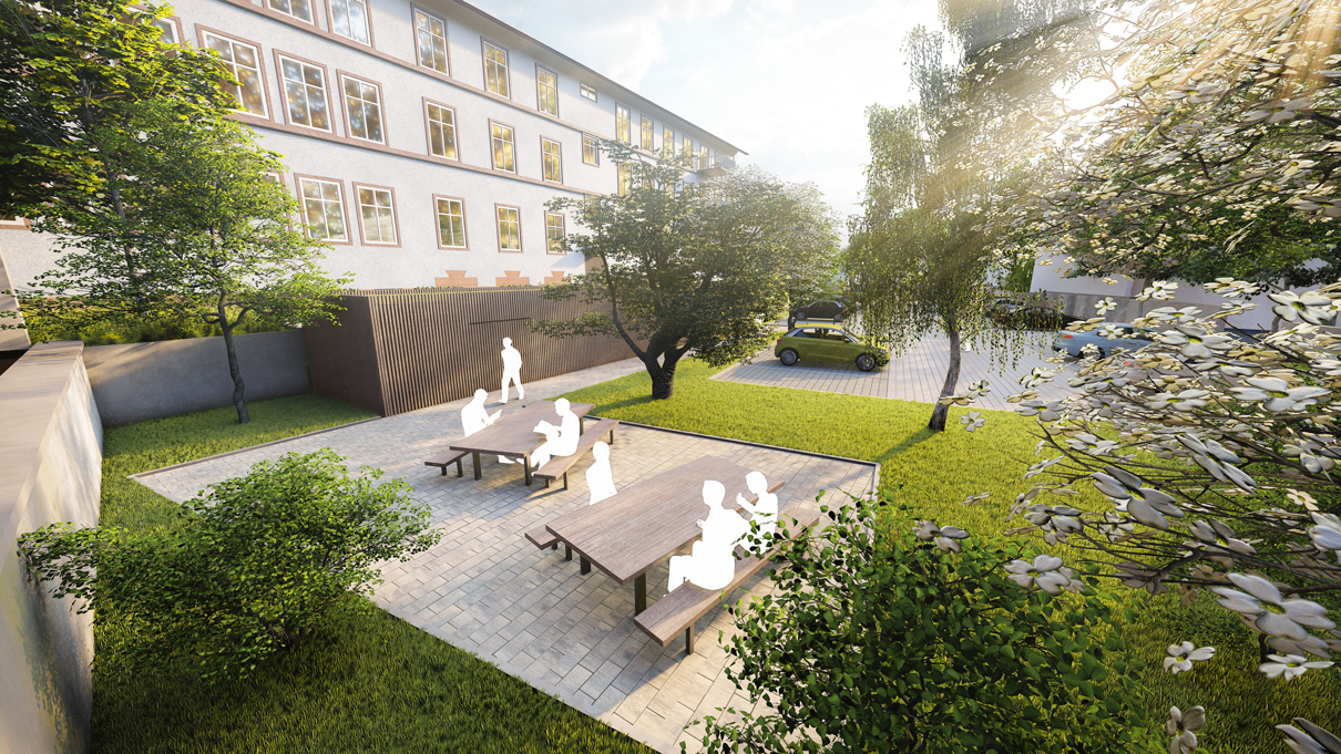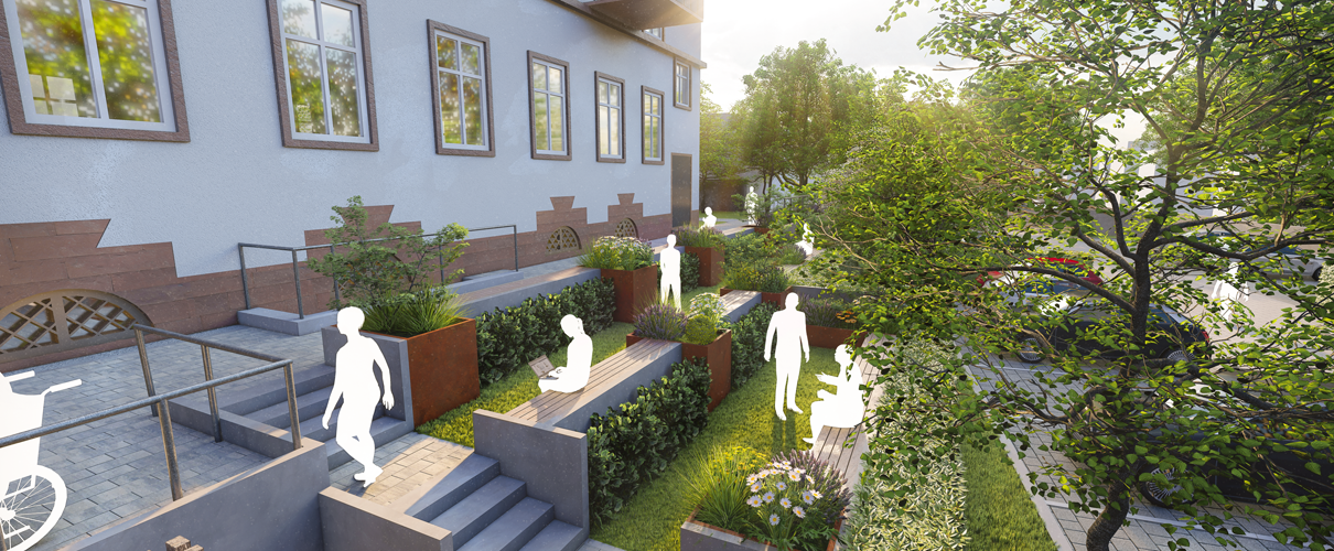 Am Hintereingang lädt eine neue Terrassierung zum Verweilen ein. Attraktive Pflanzungen und gemütliche Sitzbereiche machen den Platz zu einem Ort für Gespräche, kurze Auszeiten oder gemeinsame Pausen. Für größere Veranstaltungen des Finanzamtes entsteht ein Bereich mit Gruppentischen, der von den bestehenden Bäumen eingerahmt wird. Der wertvolle Baumbestand bleibt vollständig erhalten und sorgt für eine naturnahe Atmosphäre.