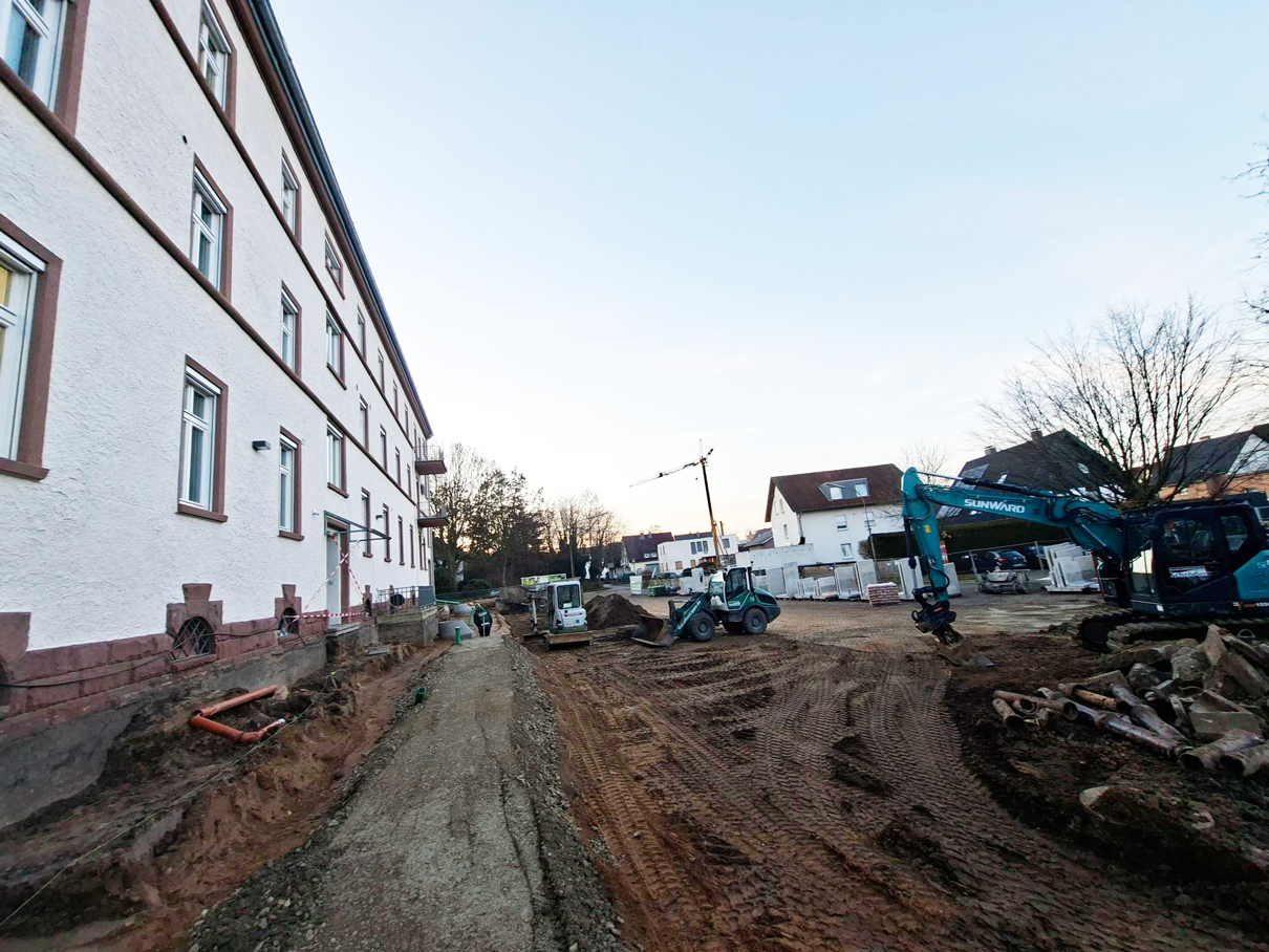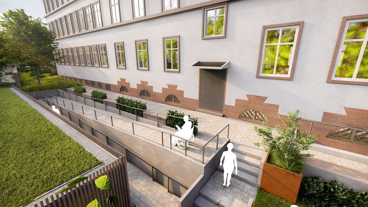 Ein zusätzlicher moderner Baukörper mit Holzlamellenfassade im neu gestalteten Parkplatzbereich bündelt praktische Funktionen: Hier befinden sich überdachte Fahrradstellplätze, Abfallbereiche und weitere Gerätschaften. Die Dachbegrünung macht den Baukörper zu einem nachhaltigen und klimafreundlichen Element der Außenanlagen.
