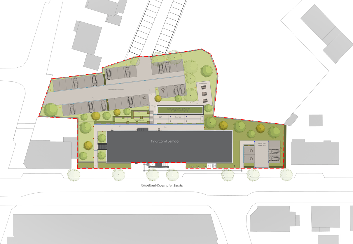 Im Rahmen der Neugestaltung der Außenanlagen beim Finanzamt Lemgo entstehen neue Bereiche, die Funktionalität und Aufenthaltsqualität harmonisch verbinden. Neben modernisierten Stellplätzen schaffen großzügige Grünflächen einladende Räume für Pausen, Begegnungen und entspannte Momente im Freien.