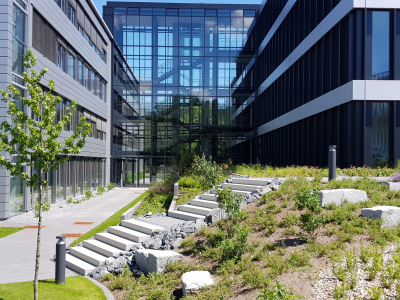 Im Herzen des Gebäudekomplexes entstanden neue Innenhöfe, gestaltet mit begehbaren Flächen, die harmonisch in die umliegenden Grünflächen übergehen. Umrahmt von abwechslungsreichen Pflanzungen bieten sie grüne Rückzugsorte, die zu kleinen Pausen im Alltag einladen. Hohe Bäume spenden Schatten, schaffen Geborgenheit und verleihen den Höfen ein naturnahes, lebendiges Ambiente.