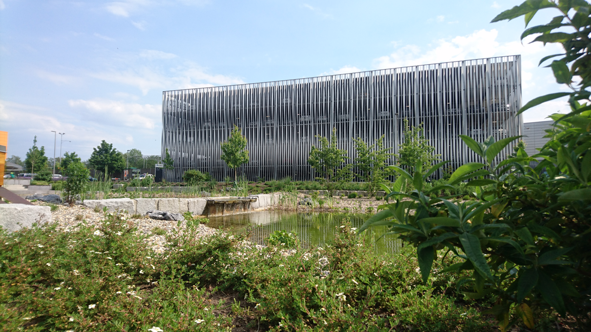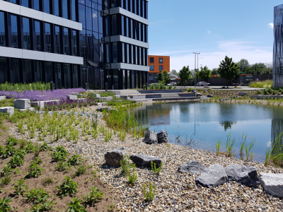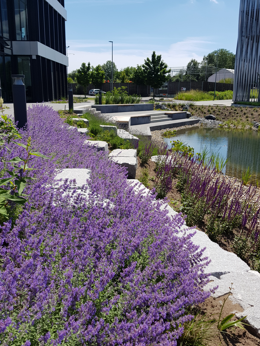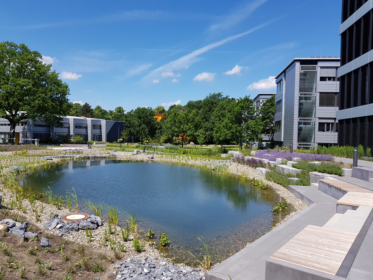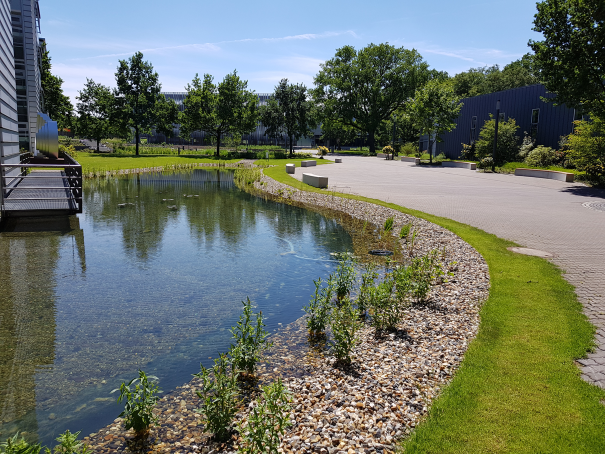Aus den stilleren Innenhöfen öffnet sich die Gestaltung hin zu einer besonders lebendigen Fläche zwischen dem neuen Komplex und dem Parkhaus. Teiche gliedern die Außenanlagen und schaffen ruhige Rückzugsorte, Trittstufen und Stufenbeete laden zu Bewegung ein, und Sitzmöglichkeiten bieten Gelegenheit zum Verweilen und Beobachten. Die unterschiedlichen Ebenen erzeugen abwechslungsreiche Blickachsen und Aufenthaltszonen, die den Platz lebendig und vielseitig nutzbar machen. Ruhige Nischen wechseln sich mit offenen Bereichen, Wasserflächen mit grünen Inseln ab, sodass die Außenanlagen ein Gefühl von Bewegung und Entdeckung vermitteln.