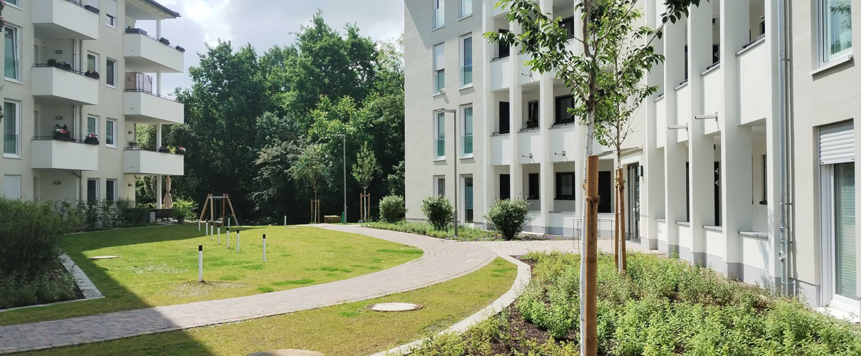 Trotz der zeitlich versetzten Bauabschnitte entstand ein zusammenhängendes, harmonisches Gesamtbild. Einheitliche Materialien und wiederkehrende Pflanzkonzepte verbinden die verschiedenen Bereiche miteinander. Durch gezielt gestaltete Übergänge zwischen den Grünanlagen wurden fließende Verbindungen geschaffen, die nicht nur gestalterisch überzeugen, sondern auch das nachbarschaftliche Miteinander fördern.