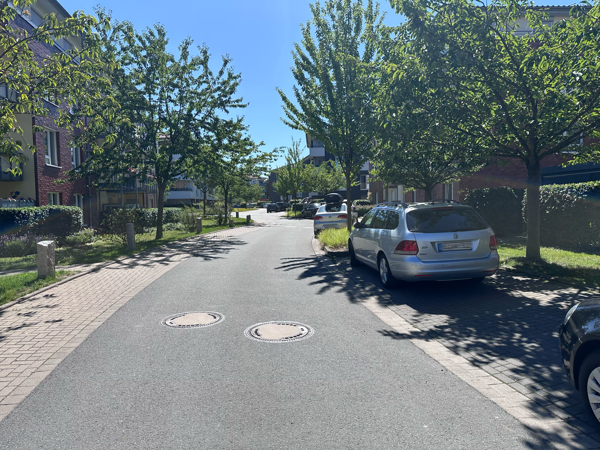 Entlang der Wohngebäude verbinden grüne Alleen, Obstbäume und durchdachte Pflanzflächen die einzelnen Bereiche miteinander. Hinter den Häusern entstehen Spiel- und Aufenthaltsbereiche, die das Verweilen fördern und Begegnungen im Grünen ermöglichen.