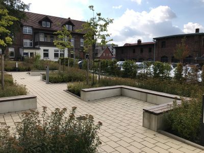 Mit dem Umbau des Wohnheims zum Hochschulbildungszentrum haben die Außenanlagen ein neues, klares Erscheinungsbild erhalten, das vor allem durch Funktionalität und Übersichtlichkeit geprägt ist. Die Wegeführung ist bewusst einfach und übersichtlich gestaltet, um den täglichen Ablauf für Studierende, Mitarbeitende und Besucher zu erleichtern. Neue Stellplätze für PKW und Fahrräder sind geschickt positioniert und bieten barrierefreie Zugänge zu den Gebäuden.