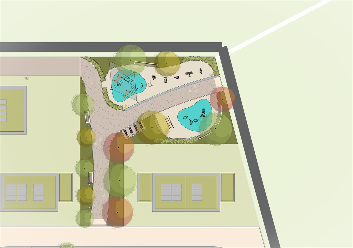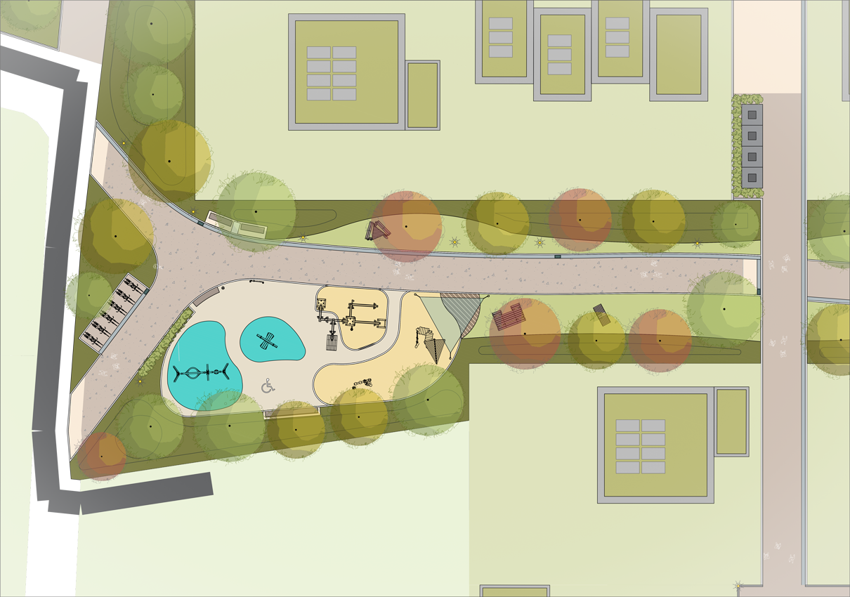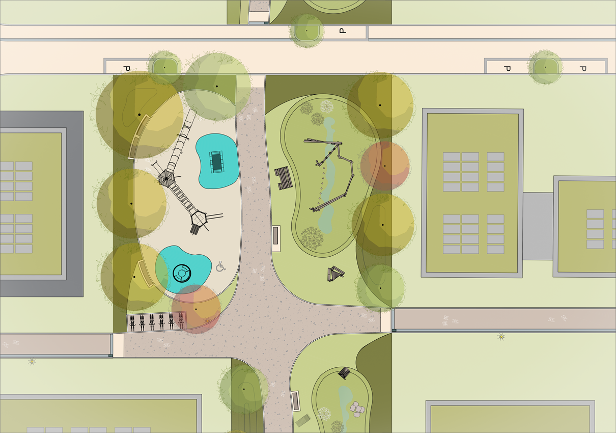Die Spielplätze sind so gestaltet, dass sie alle Kinder einladen und inklusive Angebote bieten. Ein Bereich für die Kleineren verbindet Matschanlagen, Sandspielzonen, Schaukel, Wippe und eine „Vier-gewinnt“-Wand. Eine fest installierte Lupe macht kleine Naturphänomene sichtbar und lässt Kinder die Umgebung spielerisch entdecken. Der Spielbereich für ältere Kinder umfasst ein barrierefreies Trampolin, ein Karussell sowie einen Kletter- und Rutschen-Turm. Farbige, fugenlose Bodenbeläge bilden spielerische Inseln, die Orientierung geben und die Formsprache der Quartiersplätze aufnehmen.