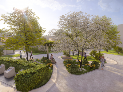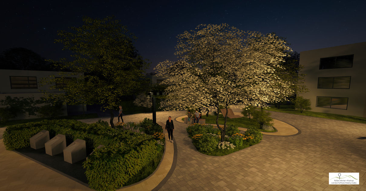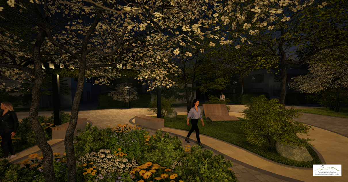 Im Zentrum steht das Konzept der „grünen Inseln“. Sie gliedern die Plätze in unterschiedliche Bereiche, durchbrechen das Pflaster mit geschwungenen Wegen und schaffen Orte, an denen Menschen verweilen, sich begegnen und den Alltag für einen Moment hinter sich lassen können. Offene Flächen, abwechslungsreiche Bepflanzungen und bewusst gestaltete Wege erzeugen spannende Blickbeziehungen und laden zum Erkunden ein.
