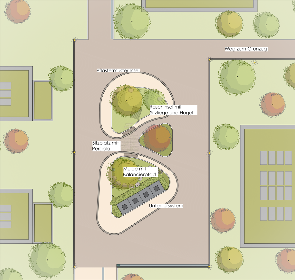Jede Insel erhält eine klare Funktion. Mindestens eine wird multifunktional sein und Platz zum Spielen, Verweilen und Austauschen bieten. Die anderen Inseln setzen auf Gestaltung, Begrünung und ökologische Mehrwerte. Bäume und Sträucher schaffen Schatten, Mikroklima und fördern die Biodiversität. Unterirdische Rigolen versorgen die Pflanzen auch in trockenen Zeiten und erhöhen das Retentionsvolumen, während moderne Unterflursysteme die Müllentsorgung unauffällig integrieren.