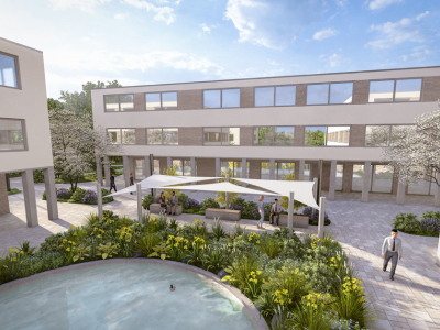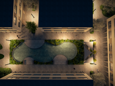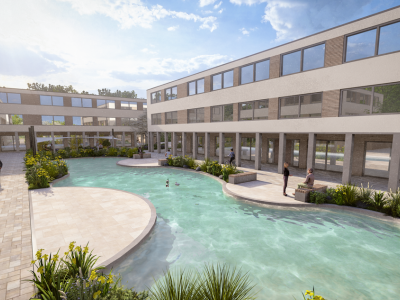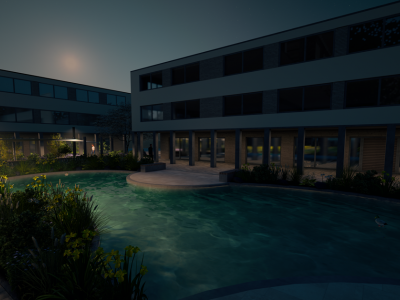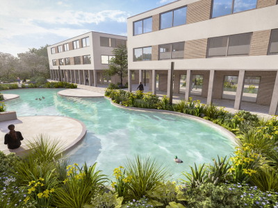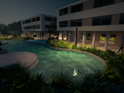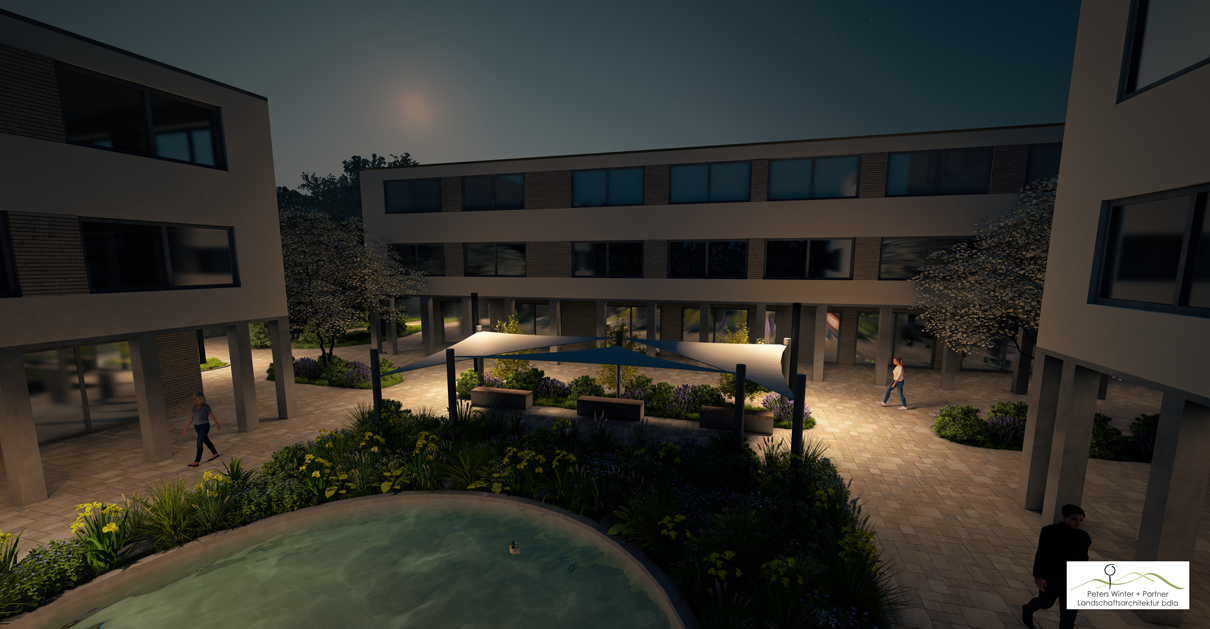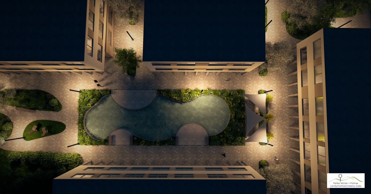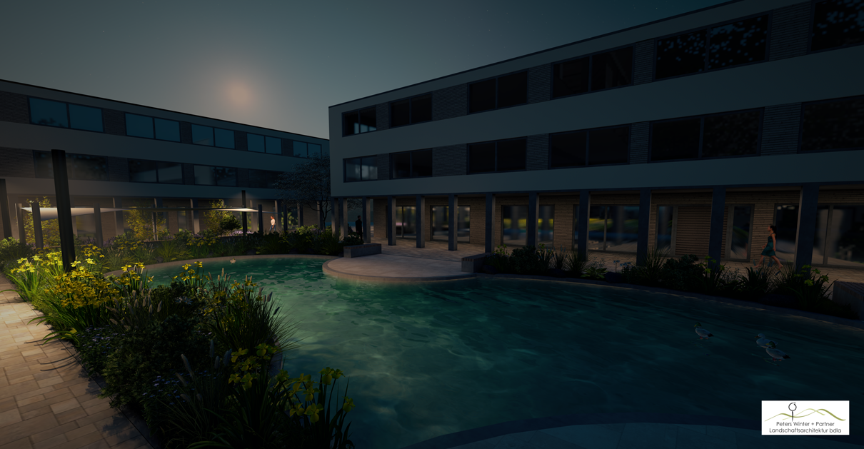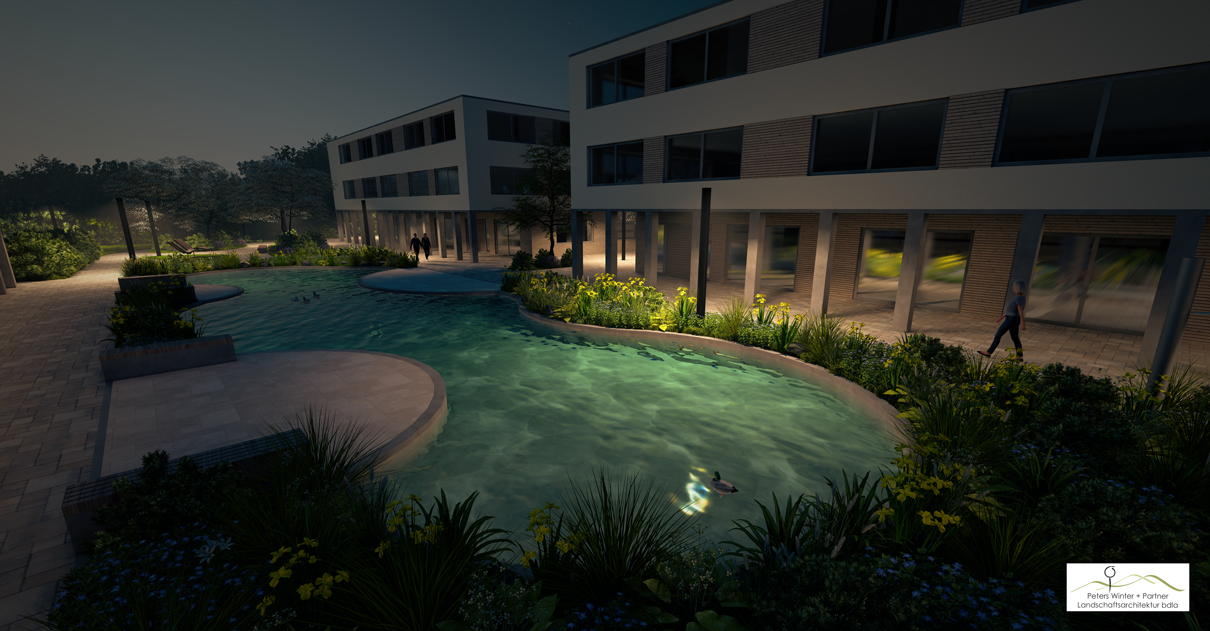 Rund um das Wasserbecken schaffen üppige Beete, Pflanzungen und Sonnensegel ein lebendiges, naturnahes Ambiente. Sitzgelegenheiten laden zum Ausruhen ein, und ein Blindenleitsystem ermöglicht barrierefreien Zugang. So entsteht ein Ort, an dem Wasser, Natur und Gemeinschaft auf nachhaltige Weise zusammenkommen, der Technik und Ästhetik verbindet und das Quartier zu einem erlebbaren, inspirierenden Raum für alle Generationen macht.