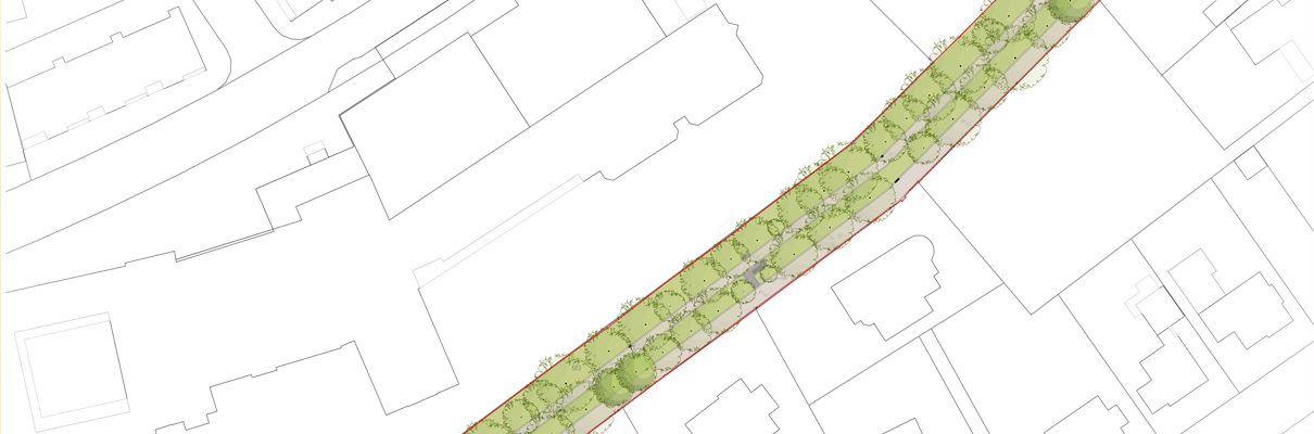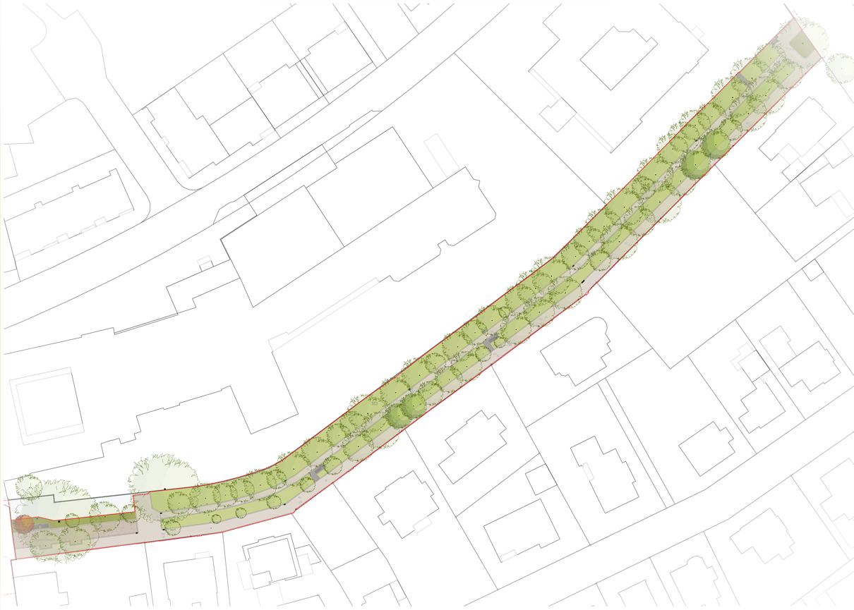 Durch den Abriss eines alten Technikgebäudes konnte der Wegverlauf begradigt und die Allee durch Neupflanzungen ergänzt werden. Auch die Eingangsbereiche wurden offener und einladender gestaltet: An der Wiesenstraße entsteht eine kleine grüne Erweiterung mit Sitzgelegenheit, an der Ahmser Straße ein neuer bepflanzter Raum mit einer Kupfer-Felsenbirne als markantem Akzent.