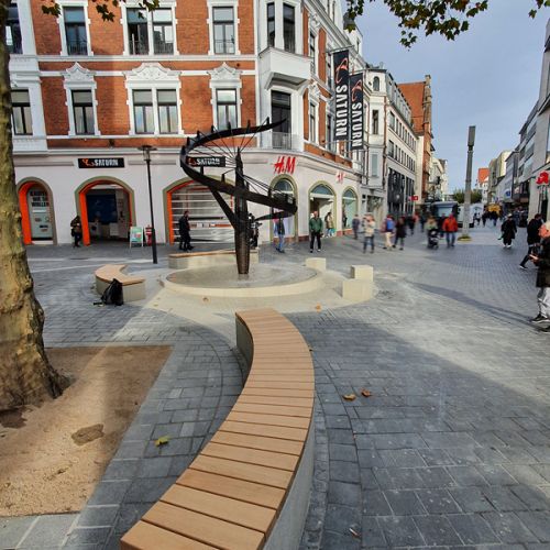 Angelehnt an die runde Form der Brunnens wurde auch das neue Becken gestaltet. Kreisförmig angeordnete Betonbänke laden zum Verweilen ein und rahmen die Skulptur harmonisch ein. Das Pflaster folgt dem Motiv der Spirale und wurde in kreisförmiger Struktur verlegt. Es nimmt die Bewegung des Wassers auf und verbindet den Brunnen mit seiner Umgebung zu einem stimmigen Gesamtbild.
