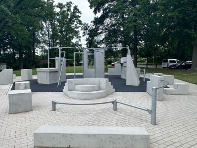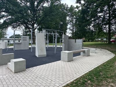 Die Anlage befindet sich direkt am Eingang des Sportparks und wird von den hohen Bestandsbäumen sowie einer Wegeverbindung zur angrenzenden Straße umrahmt. Sitzgelegenheiten laden zu Pausen und kurzen Erholungsmomenten ein, sodass Sport, Bewegung und Aufenthalt harmonisch kombiniert werden.