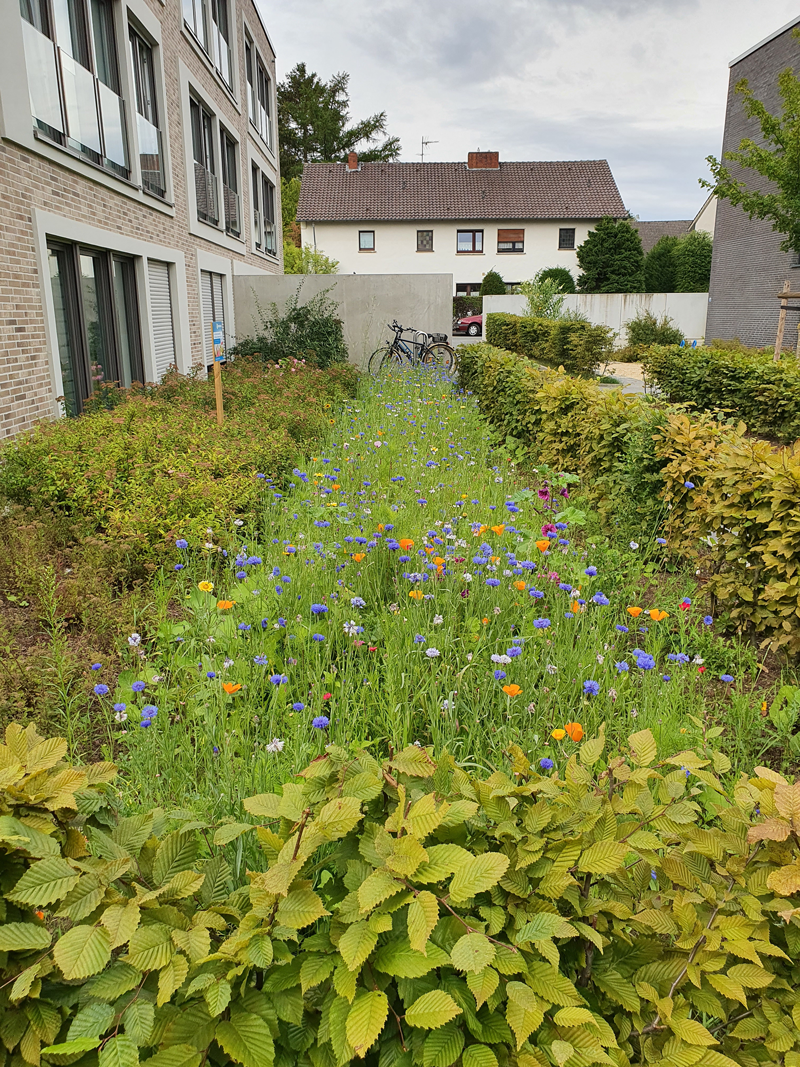 Ein durchdachtes Wegekonzept verbindet alle Gebäude miteinander und sorgt für fließende Übergänge zwischen Wohnräumen, Grünflächen und Aufenthaltsbereichen. Einheitliche Pflanzkonzepte, blühende Stauden und Hecken schaffen eine grüne, einladende Atmosphäre, die zum Spazieren, Verweilen und zur Begegnung unter Nachbarn einlädt.