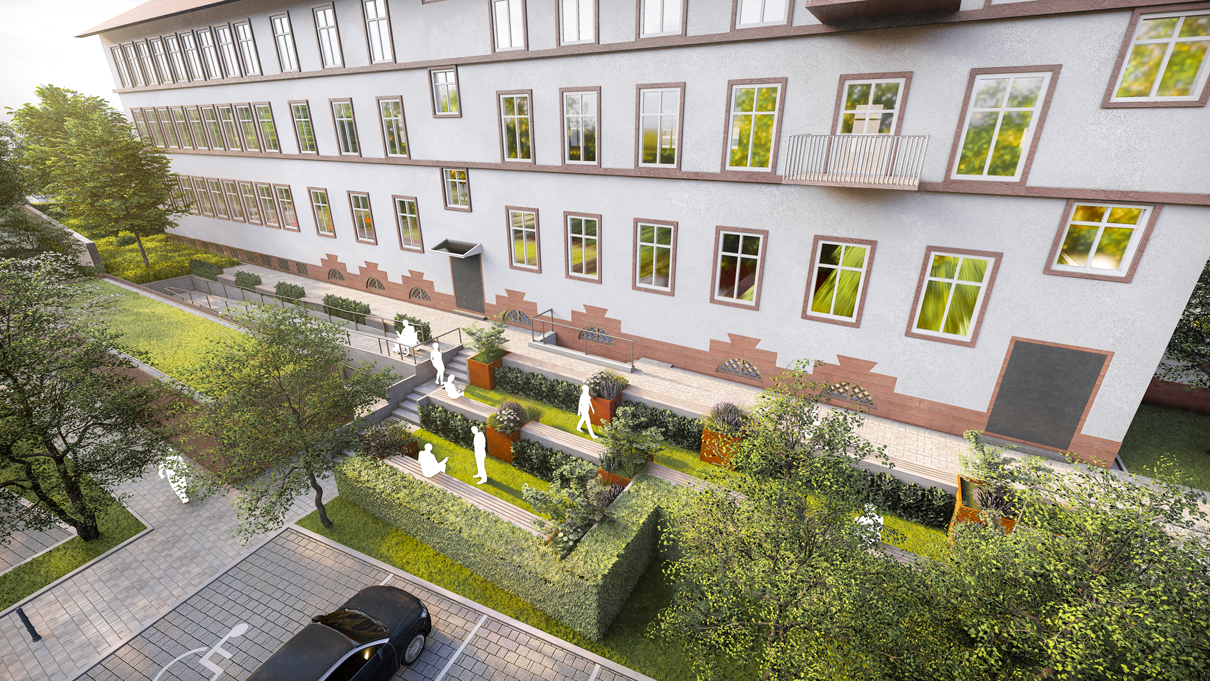 Ein zusätzlicher moderner Baukörper mit Holzlamellenfassade im neu gestalteten Parkplatzbereich bündelt praktische Funktionen: Hier befinden sich überdachte Fahrradstellplätze, Abfallbereiche und weitere Gerätschaften. Die Dachbegrünung macht den Baukörper zu einem nachhaltigen und klimafreundlichen Element der Außenanlagen.