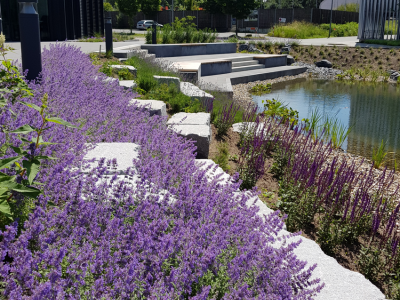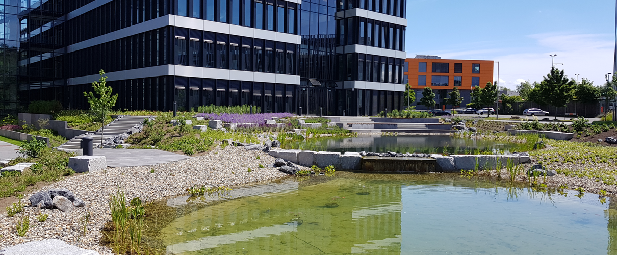 Aus den stilleren Innenhöfen öffnet sich die Gestaltung hin zu einer besonders lebendigen Fläche zwischen dem neuen Komplex und dem Parkhaus. Teiche gliedern die Außenanlagen und schaffen ruhige Rückzugsorte, Trittstufen und Stufenbeete laden zu Bewegung ein, und Sitzmöglichkeiten bieten Gelegenheit zum Verweilen und Beobachten. Die unterschiedlichen Ebenen erzeugen abwechslungsreiche Blickachsen und Aufenthaltszonen, die den Platz lebendig und vielseitig nutzbar machen. Ruhige Nischen wechseln sich mit offenen Bereichen, Wasserflächen mit grünen Inseln ab, sodass die Außenanlagen ein Gefühl von Bewegung und Entdeckung vermitteln.