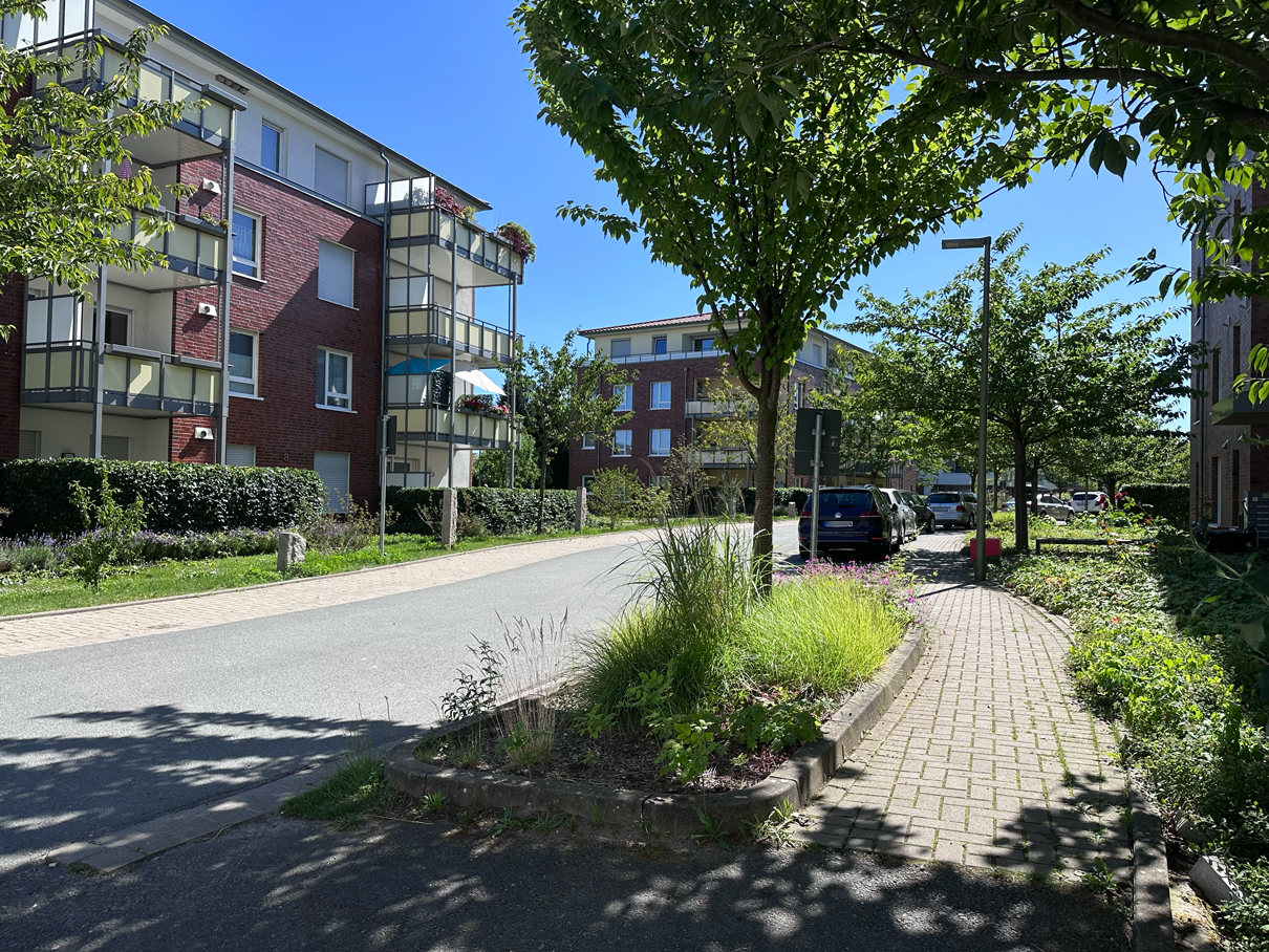 Entlang der Wohngebäude verbinden grüne Alleen, Obstbäume und durchdachte Pflanzflächen die einzelnen Bereiche miteinander. Hinter den Häusern entstehen Spiel- und Aufenthaltsbereiche, die das Verweilen fördern und Begegnungen im Grünen ermöglichen.